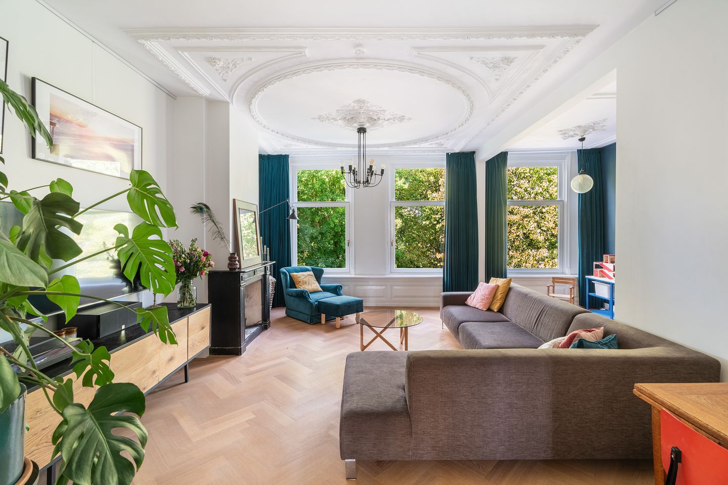 Zodra je binnenkomt, trekt de toffe brickwall meteen de aandacht – een echte eyecatcher! Vanuit de hal bereik je het leefgedeelte, het separate toilet en een grote multifunctionele inpandige kast. De living strekt zich uit over de volle lengte van het pand en ademt sfeer dankzij de hoge plafonds met sierlijke ornamenten, grote raampartijen en de prachtige houten visgraatvloer met vloerverwarming.