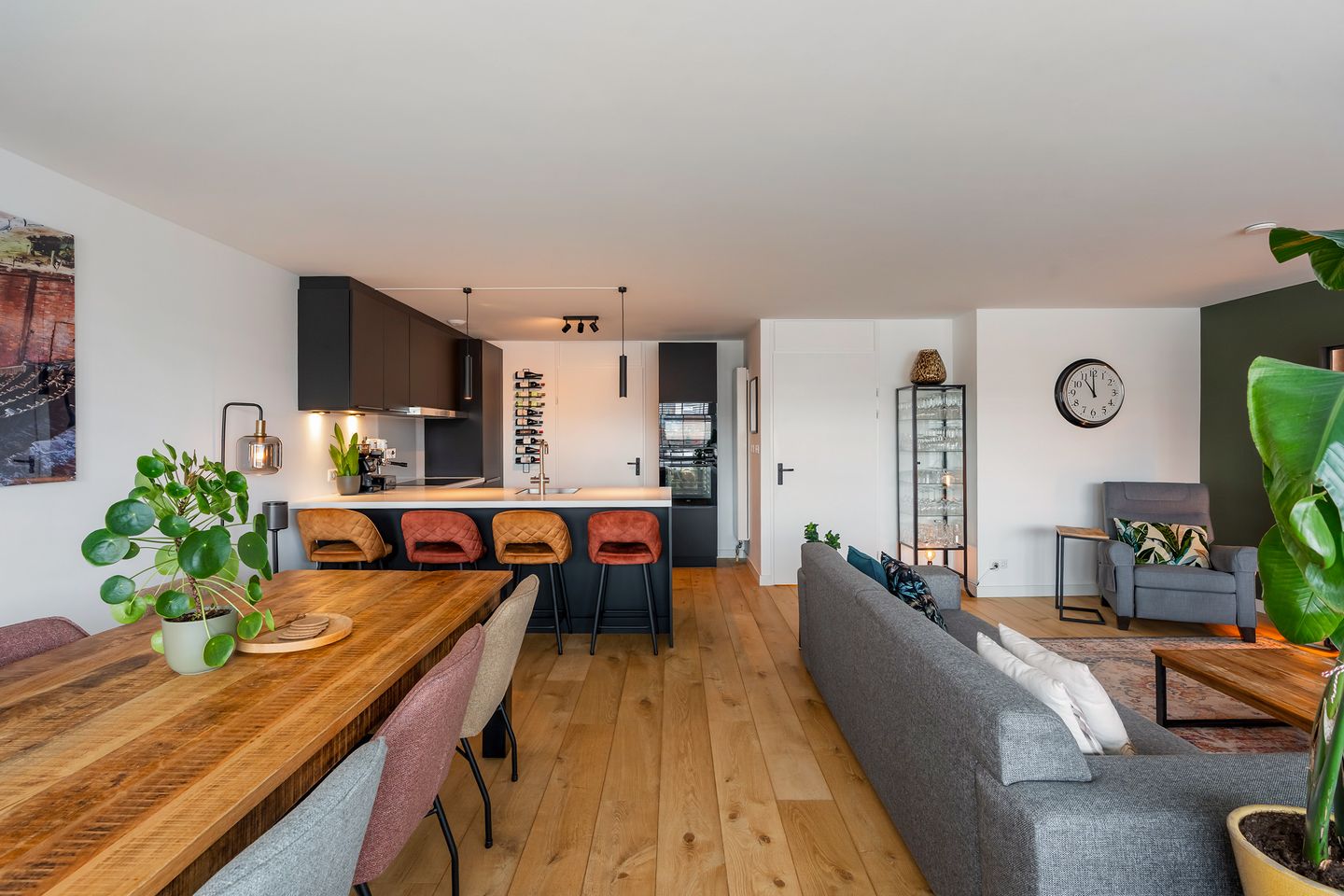 Via de L-vormige entree stap je binnen in het hart van de woning: een heerlijk licht en sfeervol leefgedeelte. De prachtige eikenhouten vloer zorgt direct voor een warme uitstraling en vormt de perfecte basis voor het open karakter van de ruimte. Hier vloeien de zithoek, eethoek en keuken moeiteloos in elkaar over – een plek waar gezelligheid en comfort samenkomen.