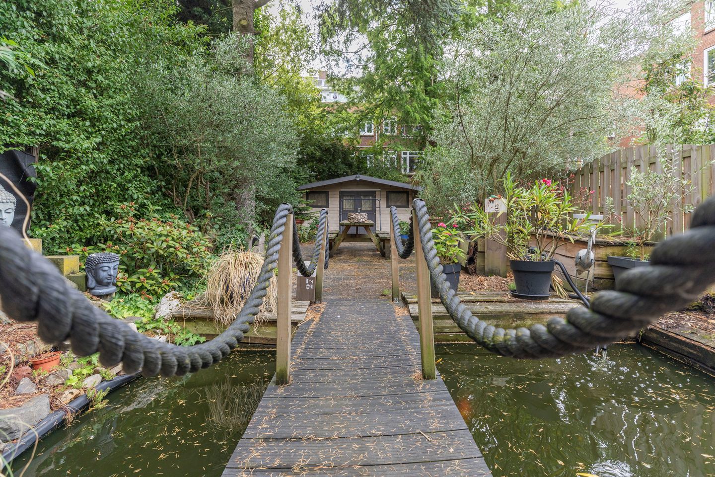 Verrassend ruime (ca. 150m²) en bijzonder fraai aangelegde tuin, compleet met nette bestrating, houten vlonder, vijver, beplanting en een gezellige loungehoek. De houten schuur is ideaal voor het opbergen van de tuinspullen of als extra ruimte.