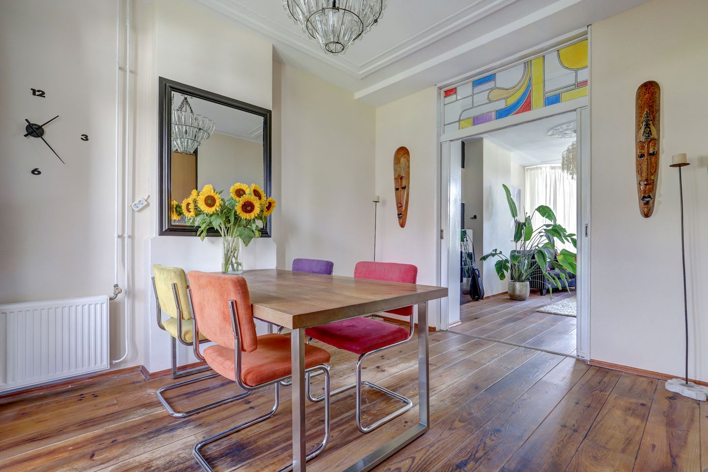 1e Verdieping: overloop met een modern toilet, heerlijke lichte, smaakvol afgewerkte woonkamer ensuite voorzien van dubbele deuren met toegang tot het leuke balkon. De open keuken beschikt over een vaatwasser, gaskookplaat, oven, koelkast en een afzuigkap. Het geheel is afgewerkt met fraaie houten vloerdelen.