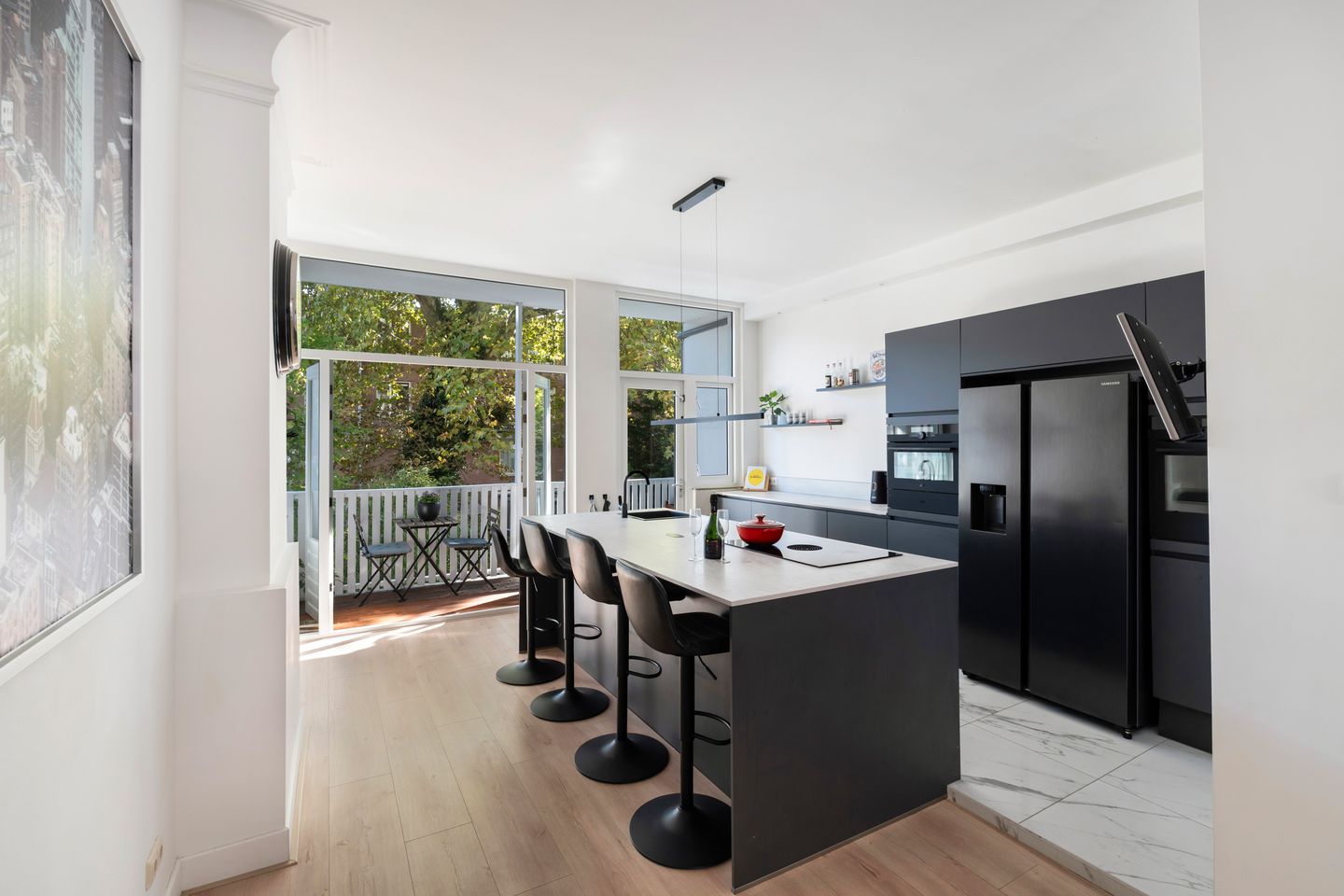 De luxe woonkeuken aan de achterzijde van de woning is in 2021 volledig vernieuwd en hoogwaardig afgewerkt. Het doordachte ontwerp met bargedeelte combineert stijl en functionaliteit en maakt het de ideale plek om te koken, borrelen en samen te komen. Dankzij de directe verbinding met het balkon geniet u hier van veel licht en een heerlijk binnen-buiten gevoel." De keuken met een fraai eiland is compleet uitgerust met inbouwapparatuur zoals AEG vaatwasser, Bora inductie kookplaat met geïntrigeerde afzuiging, AEG oven, AEG combi oven met warmhoudlade en Amerikaanse koelkast en vriezer Fraaie vloer, gestuukte wanden en plafonds, deels met ornamenten en plafondplinten