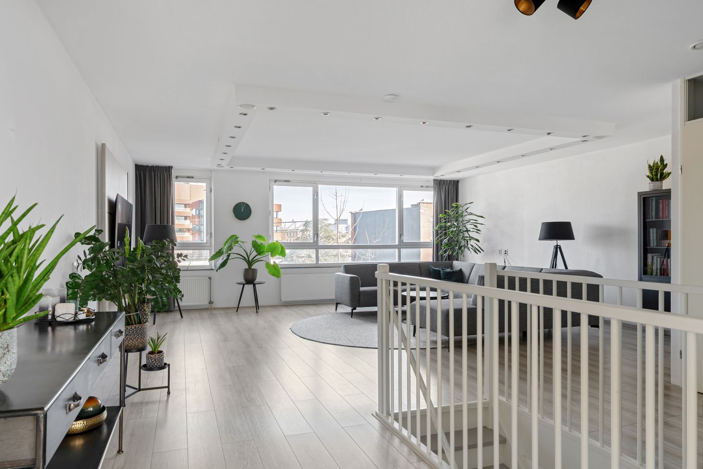 De royale woonkamer aan de voorzijde is heerlijk licht dankzij de grote raampartijen en biedt uitzicht richting het Hofbogenpark.