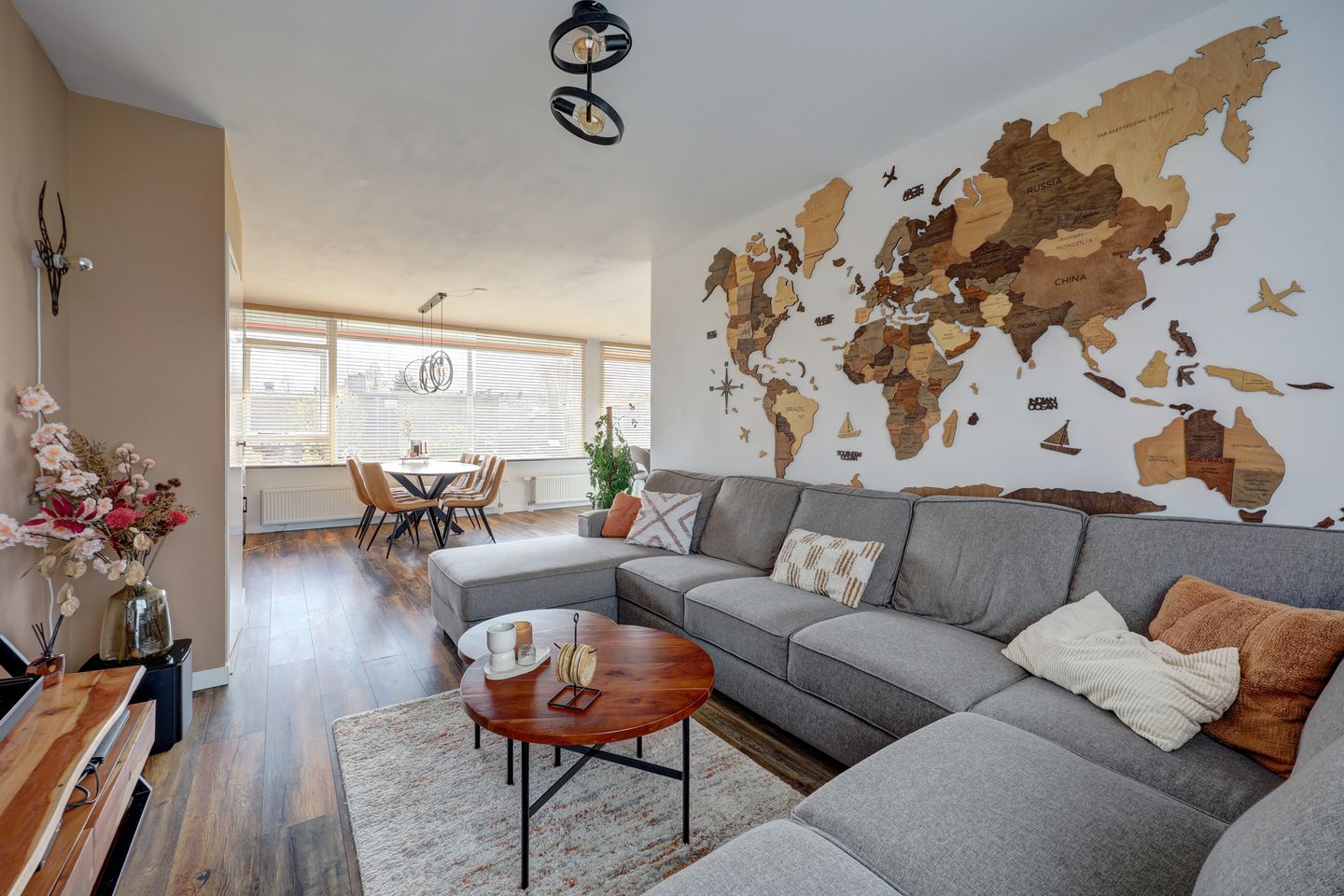 Op de eerste verdieping bevindt zich de royale en lichte leefruimte. De woonkamer is ruim opgezet en profiteert van grote raampartijen, waardoor er een prettige hoeveelheid daglicht binnenvalt. De warme laminaatvloer en de verzorgde afwerking geven het geheel een uitnodigende sfeer. De wand met decoratieve wereldkaart vormt een echte blikvanger en geeft de ruimte een eigentijds karakter.