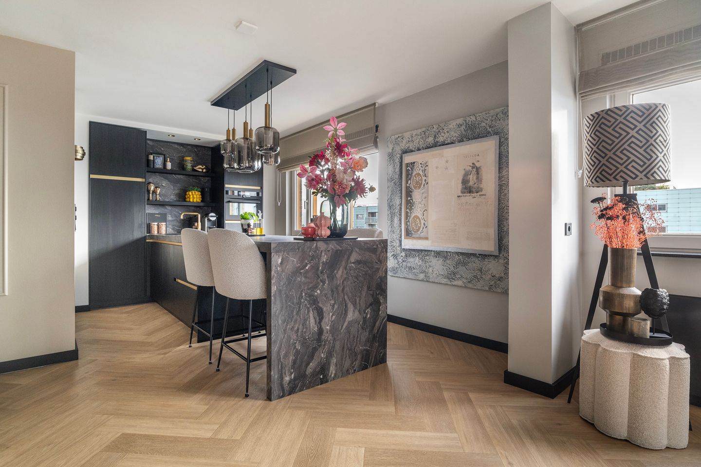 De stoere glazen Gers deuren met rookglas geven je een warm welkom in de ruime living met open keuken van circa 49 m². Wat ziet het er hier goed uit! De strak zwarte keuken springt er duidelijk uit met de rest van de woning, dat vooral lekker licht is door de raampartijen aan weerszijden. Een van de grote voordelen van een hoekappartement. Op de zonnige dagen verkoel je de ruimte door het aanzetten van de airco óf sla je de deuren open naar het balkon waar je je ogen uitkijkt over het panoramische uitzicht. Wat een plaatje! Het balkon is gelegen op het zuidwesten waardoor je de gehele dag geniet van het zonnetje.
