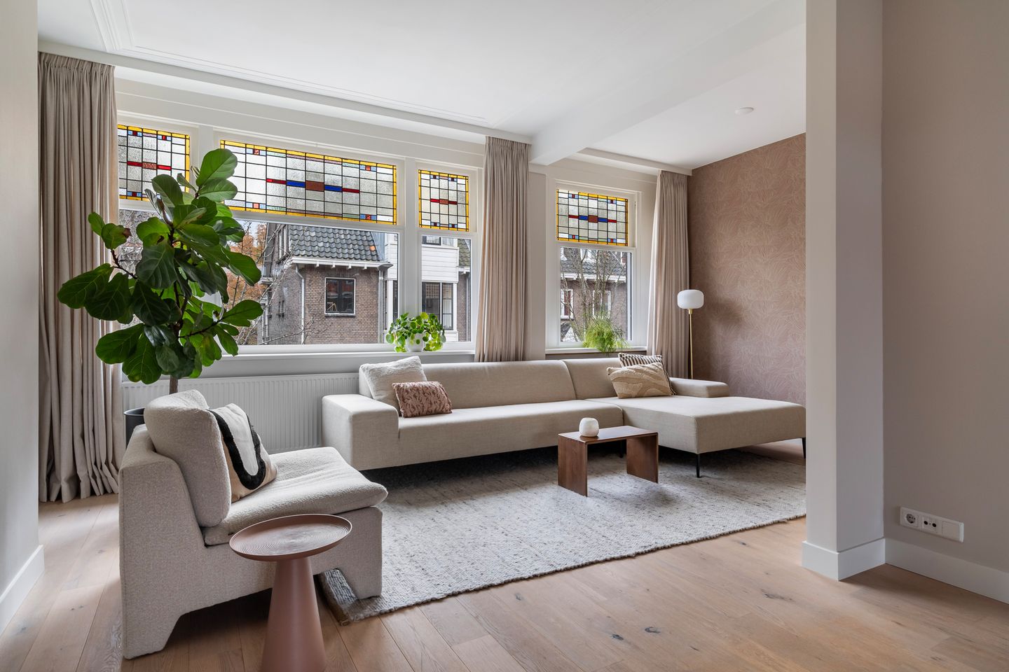 Ruime overloop met toegang tot het toilet, de lichte woonkamer en de keuken. De riante woonkamer heeft een lengte van bijna 11 meter en voelt extra ruim door de hoge plafonds. De grote ramen laten veel natuurlijk licht binnen en bieden een prachtig uitzicht op de rustige straat. Het glas-in-lood voegt extra karakter en sfeer toe aan de ruimte. De woonkamer is opgedeeld in een woon- en eetgedeelte.