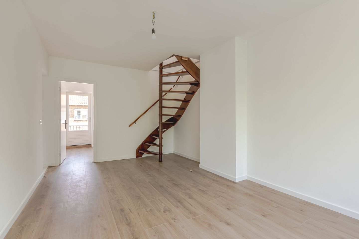 * Lichte woonkamer aan de achterzijde voorzien van laminaatvloer, gestucte wanden en plafond en een wenteltrap naar de zolderverdieping.