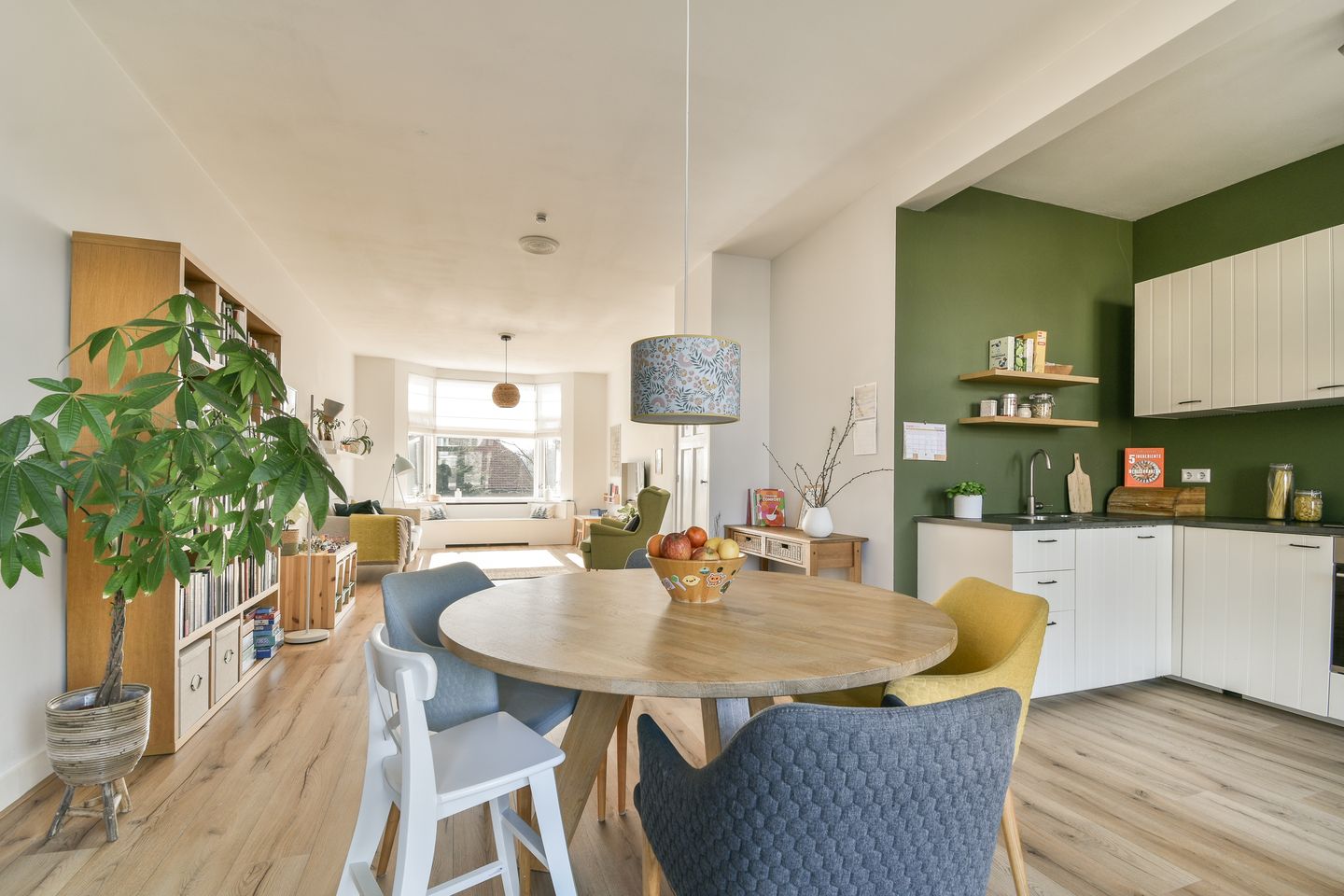 Overloop. Betegeld toilet met wandcloset en fonteintje. De lichte woonkamer ademt sfeer en karakter, met een prachtige erker die zorgt voor veel lichtinval. Aan de achterzijde bevindt zich het eetgedeelte, dat dankzij de openslaande deuren direct in verbinding staat met het balkon. De sfeervolle keuken is opengebroken en beschikt over diverse inbouwapparatuur. Aan de voorzijde treffen we de eerste slaapkamer annex werkkamer.