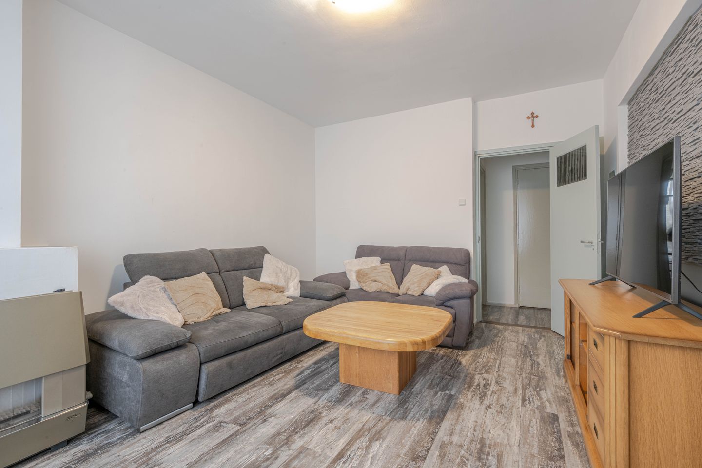 * Woonkamer met schouw, gestuukte wanden en laminaatvloer.