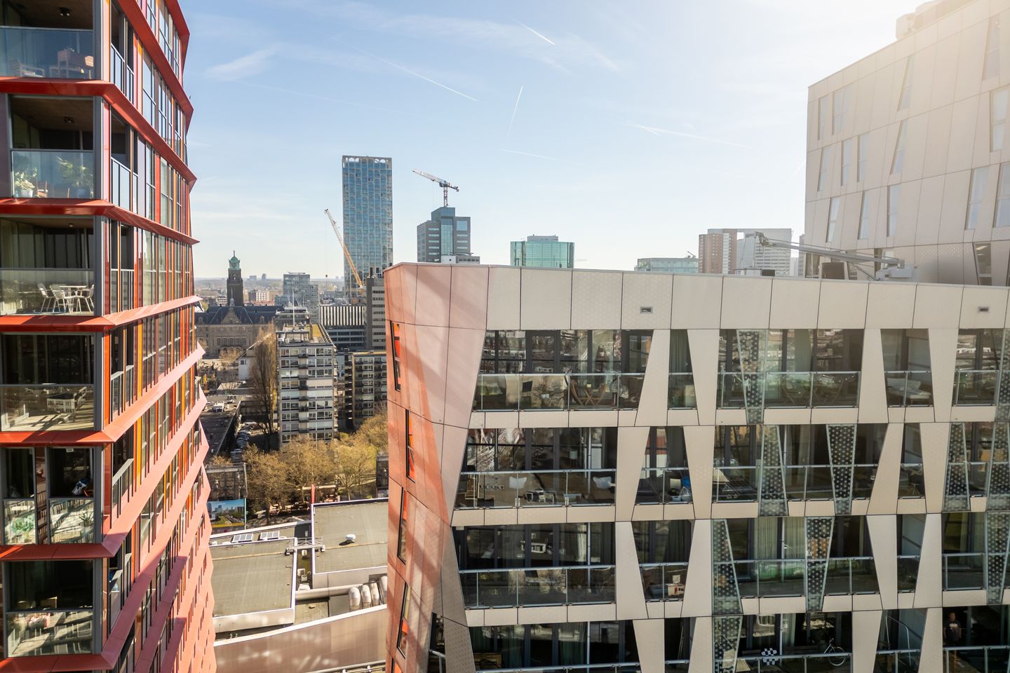 Entree, hal met toegang tot diverse vertrekken waaronder de woonkamer. Bij binnenkomst geniet je hier direct van het indrukwekkende uitzicht over de stad. De open keuken sluit naadloos aan op de woonkamer en is uitgevoerd met een spoeleiland met bar. De keuken is compleet uitgerust met een inductiekookplaat, afzuigkap, combi-oven, vaatwasser en koel-vriescombinatie. De woonkamer beschikt tevens over een toegang tot een inpandige bergruimte welke goed te gebruiken is als inloopkast of bijkeuken. Het overdekte balkon is royaal van formaat en biedt veel privacy. Dankzij de ligging op het westen geniet je hier van de middag- en avondzon, terwijl je uitkijkt over de stad met zicht op diverse Rotterdamse iconen, zoals de Euromast en Centraal Station.