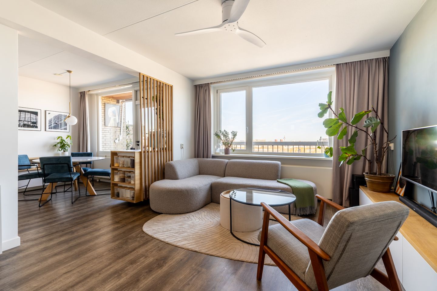 De woonkamer is royaal opgezet en valt direct op door de grote raampartij met een indrukwekkend uitzicht over de skyline van Rotterdam. Dankzij de rechte indeling is de ruimte efficiënt in te delen en is er zelfs een werkplek gecreëerd. Screens aan de buitenzijde zorgen ervoor dat het binnen ook op warme dagen aangenaam blijft.