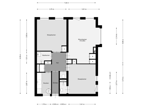 Via de entree met meterkast, moderne badkamer met douche en wastafel, en separaat toilet kom je in de centrale hal, die toegang biedt tot alle vertrekken. Aan de voorzijde bevindt zich de keuken met een praktische opstelling. De woonkamer is opvallend ruim, doordat deze momenteel één van de oorspronkelijke slaapkamers omvat. Vanuit deze woonkamer bereik je direct de 2e badkamer(inloopdouche). Indien gewenst, kan de ruimte eenvoudig weer worden teruggebracht naar de originele indeling met een tweede slaapkamer. Daarnaast beschikt de woning over een ruime slaapkamer met grote raampartijen, wat zorgt voor een prettige lichtinval. Diverse vaste kasten bieden extra bergruimte.