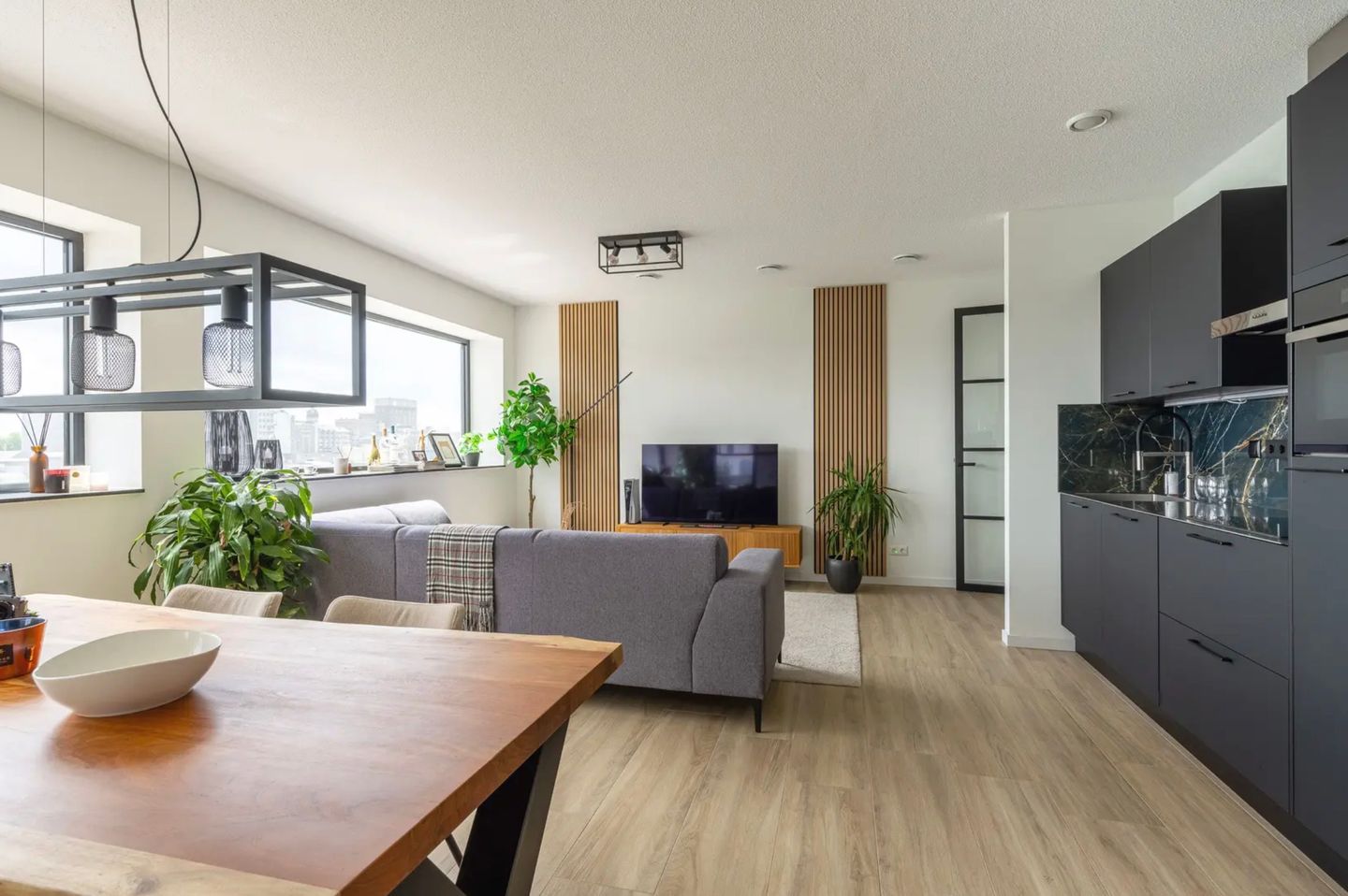 Entree in ruime hal. Modern toilet met fonteintje, technische ruimte met WTW unit en bergkast met aansluitingen voor wasmachine en droger. De lichte woonkamer met wood-up panelen en luxueus afgewerkte open keuken met een marmeren achterwand, inductiekookplaat, combi-oven/magnetron, vaatwasser, geeft toegang tot het balkon van ca. 8 m² (zuid-oost) met uitzicht op de Maashaven.