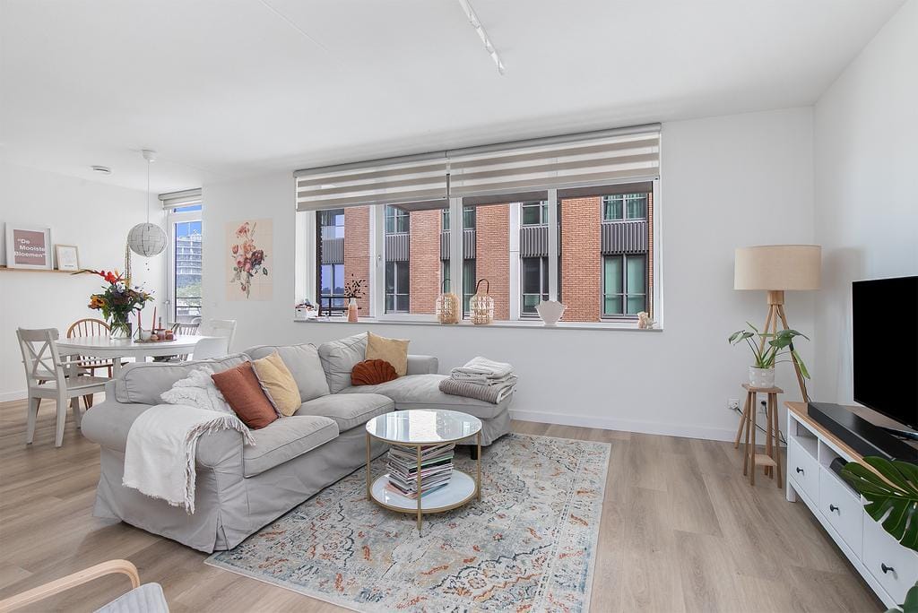 Entree, ruime hal met meterkast en intercom, separaat toilet met fonteintje, ruime wasruimte met opstelling wasmachine en opstelling warmte-terug-win-systeem, royale woonkamer met veel lichtinval, uitzicht op de Groene Loper en open Siematic keuken voorzien van diverse Siemens inbouwapparatuur. Vanuit de woonkamer toegang tot het ruime balkon.