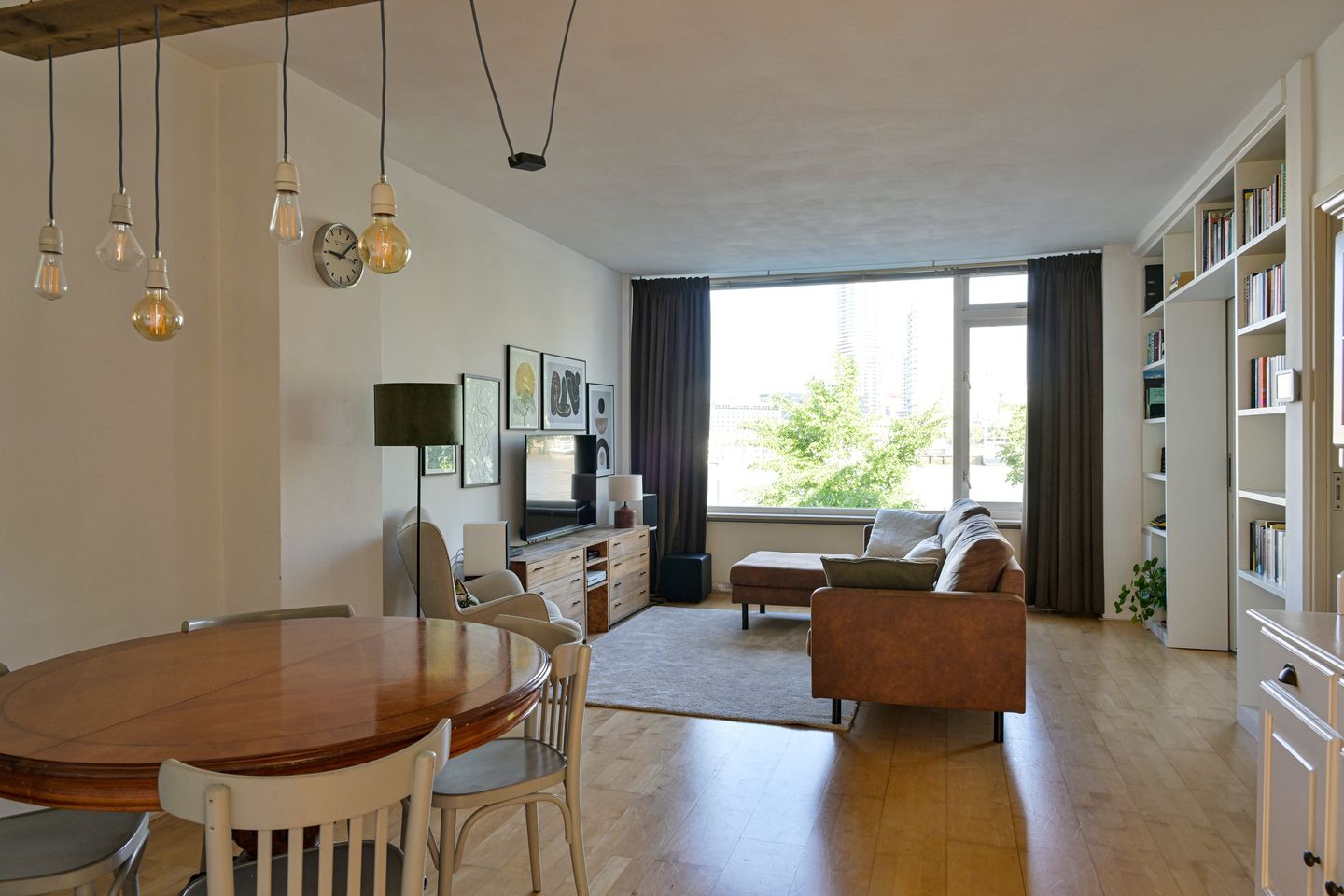 Ruime en lichte woon-eetkamer (ca. 6.84x 3.78m) met een groot raam aan de voorzijde, met schilderachtig uitzicht over de Maas.