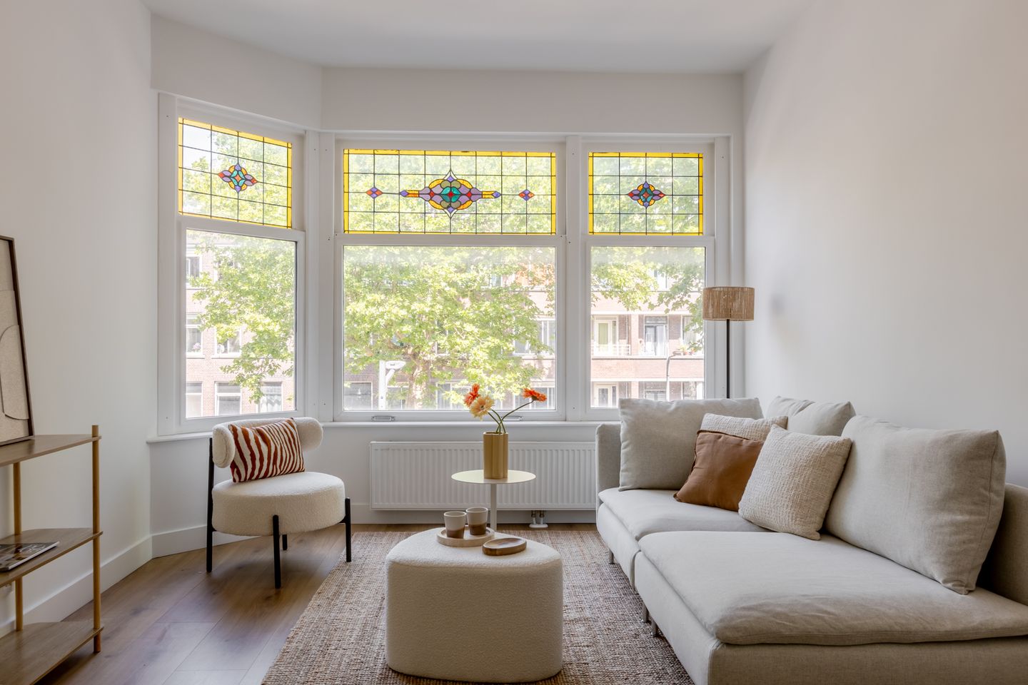 Welkom thuis! Je stapt binnen in een lichte entree met toegang tot alle vertrekken. De woonkamer bevindt zich aan de voorzijde en is voorzien van prachtige raampartijen met glas-in-lood bovenlichten, waardoor het daglicht rijkelijk naar binnen valt. Hier is meer dan genoeg plek voor een fijne zithoek én eettafel. De open keuken in hoekopstelling is modern uitgevoerd in wit en voorzien van diverse inbouwapparatuur zoals een oven, kookplaat, afzuigkap en koelkast.