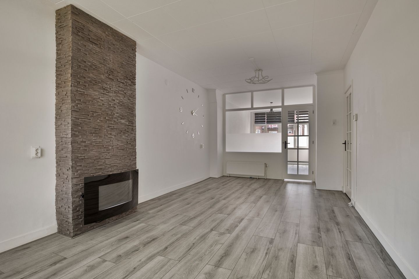 Riante woonkamer: Voorzien van strak gestuukte wanden en laminaatvloer. De woonkamer is groot genoeg om een gezellige eethoek te creëren;