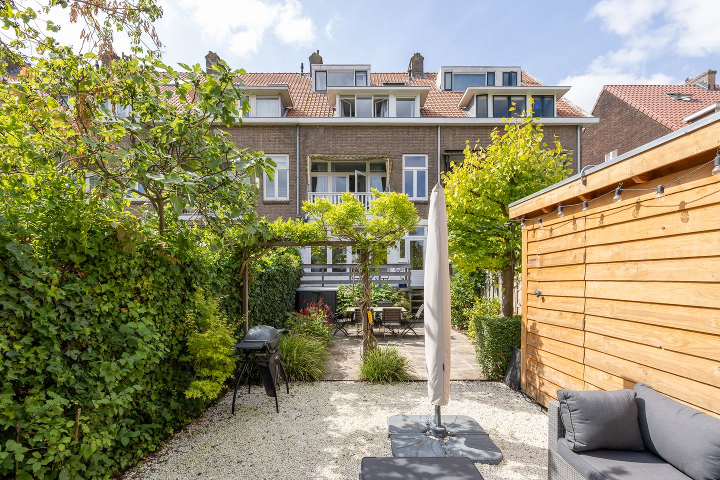 De fraai aangelegde tuin van ca. 13 meter diep biedt veel privacy en is ingericht met sierbestrating, groenborders en een houten berging. Een fijne plek om van de zon te genieten of gezellig buiten te eten.
