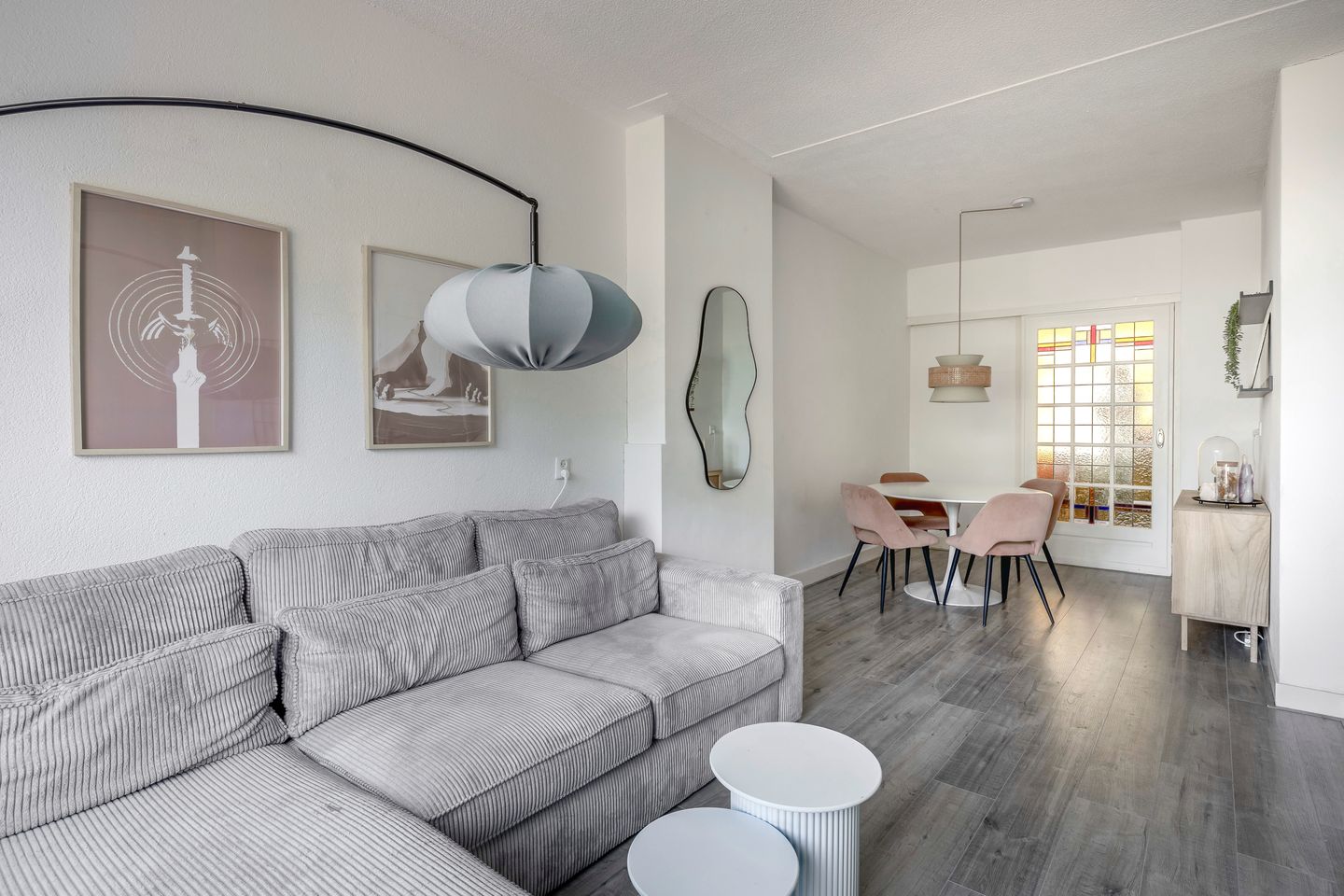 Aan de voorzijde is de woonkamer gelegen. Kenmerkend zijn de grote raampartijen die voor veel natuurlijk lichtinval zorgen. Er ligt een houtlook laminaatvloer, die over de gehele woning is doorgelegd.