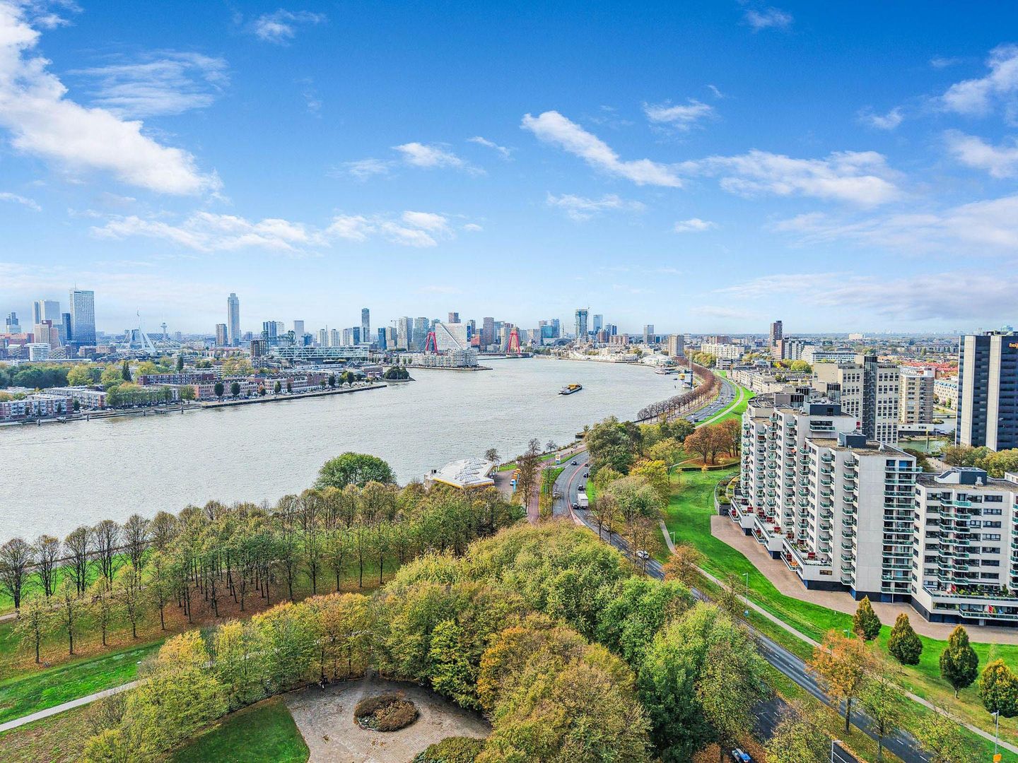 Het complex ligt aan de rand van Kralingen, vlak bij de Maasboulevard en met alle voorzieningen van de wijk binnen handbereik. Hier woon je rustig en toch dicht bij het centrum. Het appartement zelf ademt warmte en kwaliteit. De prachtige houten visgraatvloer loopt door tot in bijna alle ruimtes en zorgt voor een rustige, luxe uitstraling. De moderne keuken met natuurstenen blad ligt aan de oostzijde en biedt toegang tot een klein balkon met ochtendzon. Aan de zuidzijde bevindt zich de royale woonkamer met grote ramen en een schuifpui naar het grote terras op het zuiden, dat uitkijkt over het groen langs de Maasboulevard. De tweede slaapkamer is nu ingericht als werkkamer en bibliotheek, met rondom kasten en toegang tot het tweede balkon op het Zuiden.