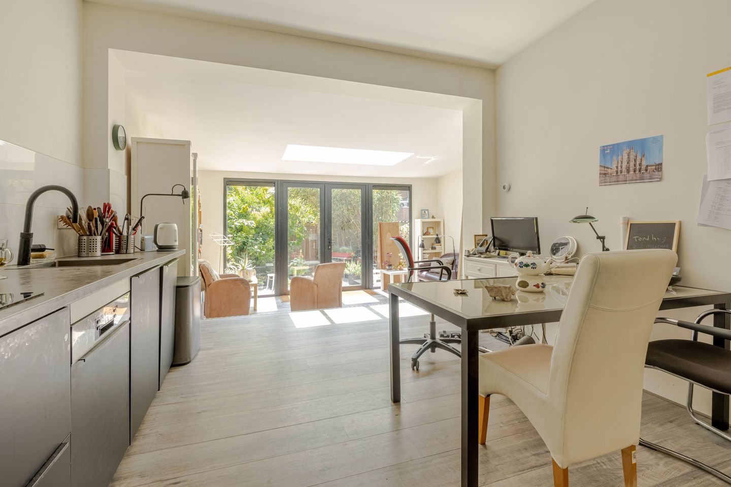 * Lagergelegen woonkamer aan de achterzijde in de uitbouw voorzien van PVC-vloer, lichtstraat in het plafond, openslaande deuren naar de tuin en strakke wand-/ en plafondafwerking.