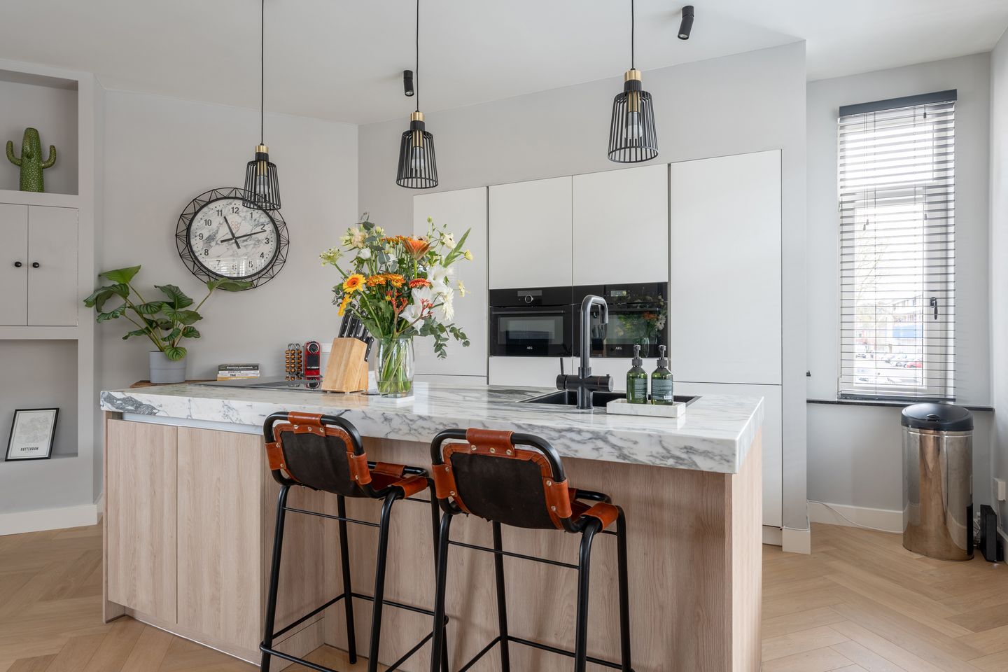 De keuken is een echte eyecatcher. Het kookeiland met lichte houten kasten en een dik Arabescato Corchia marmeren blad vormt het hart van de ruimte. De apparatenwand biedt volop bergruimte en is voorzien van hoogwaardige inbouwapparatuur: een AEG-inductiekookplaat met geïntegreerd afzuigsysteem, vaatwasser, twee combi-ovens, kokend waterkraan en een koel-vriescombinatie. Hier kook je met gemak voor een groot gezelschap.