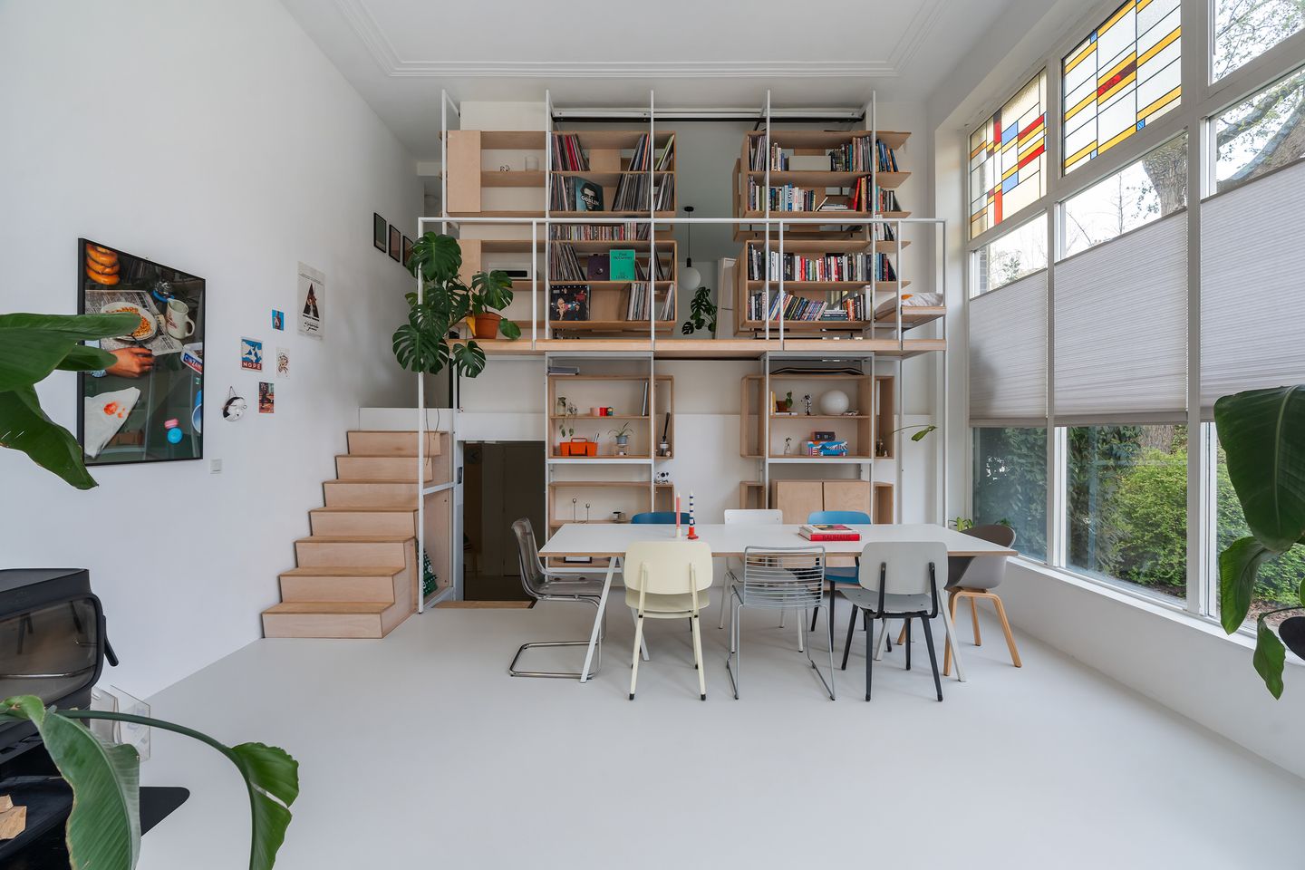 Kom binnen in de eetkamer. Deze ruimte vormt het kloppend hart van de woning en springt direct in het oog dankzij de door een architect ontworpen, indrukwekkende maatwerk stellingkast die zowel functioneel als esthetisch een statement maakt. De houtkachel vormt een sfeervol middelpunt, terwijl de grote raampartijen zorgen voor een prettige verbinding met buiten. De open structuur, gecombineerd met de hoge plafonds en de prachtige glas-in-loodramen, zorgt voor een speels lijnenspel van licht en kleur gedurende de dag. Het is een plek waar lange diners en gezellige avonden als vanzelf ontstaan.
