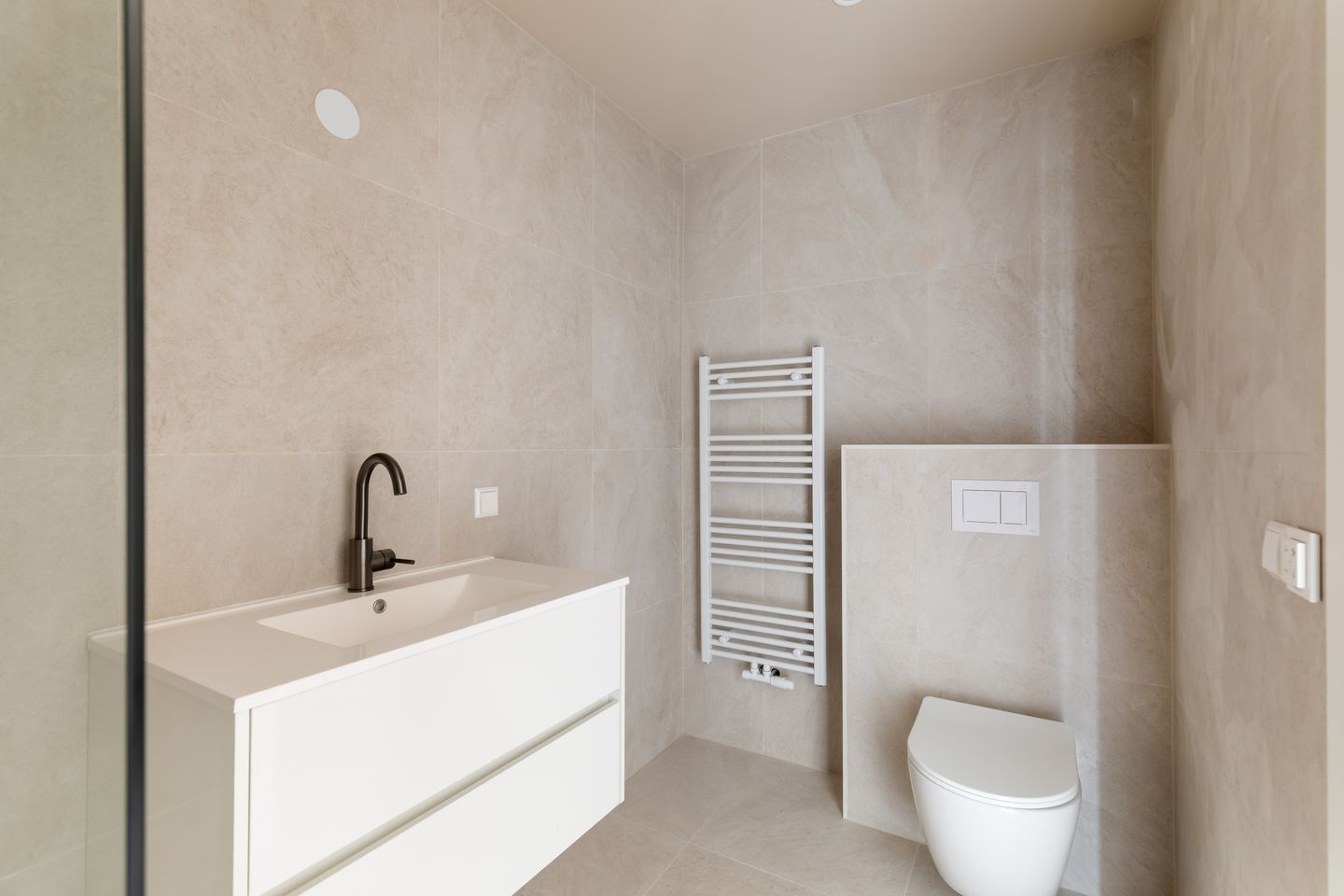De badkamer is een echte eyecatcher: volledig vernieuwd, voorzien van een luxe inloopdouche met regendouche, toilet, modern tegelwerk, wastafelmeubel en een strak afgewerkt plafond met inbouwspots.