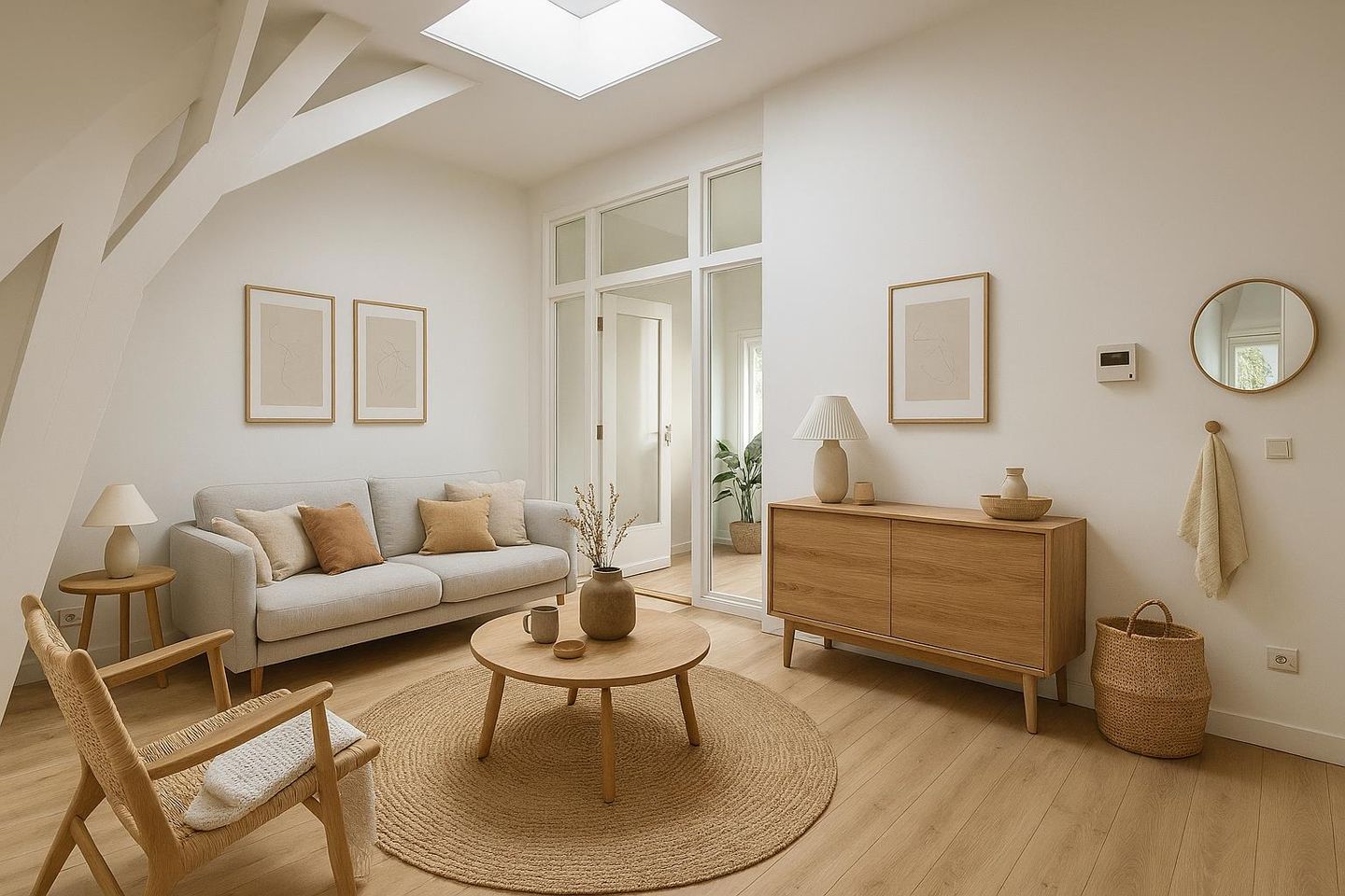 Bij binnenkomst valt direct de prettige lichtinval op. De woonkamer is sfeervol en functioneel, voorzien van een dakraam én toegang tot het balkon aan de achterzijde – perfect voor een moment in de buitenlucht.