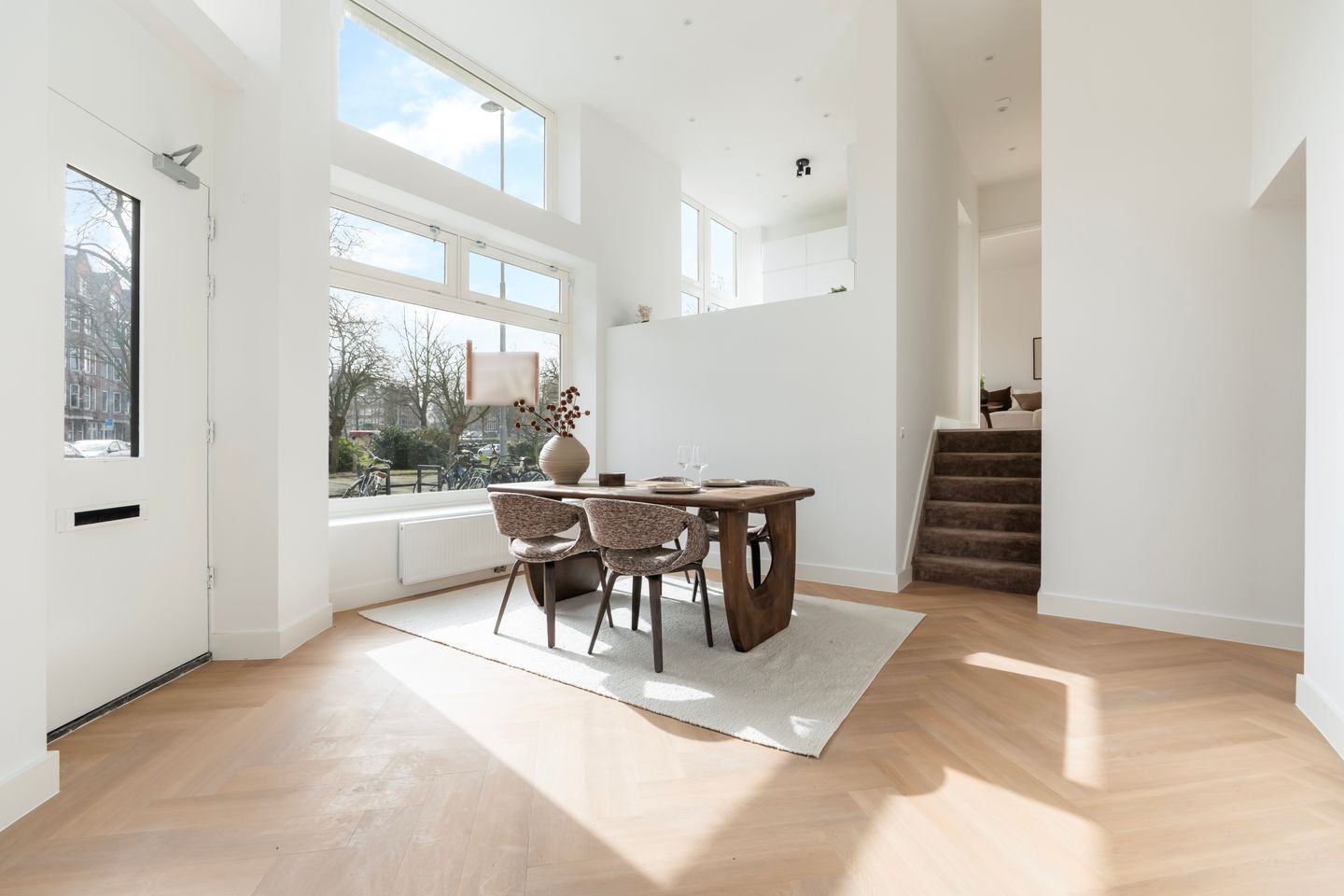 De speelse splitlevel-indeling en de spectaculaire woonkamer, met een plafondhoogte van ruim 4 meter, geven deze woning direct sfeer en grandeur.