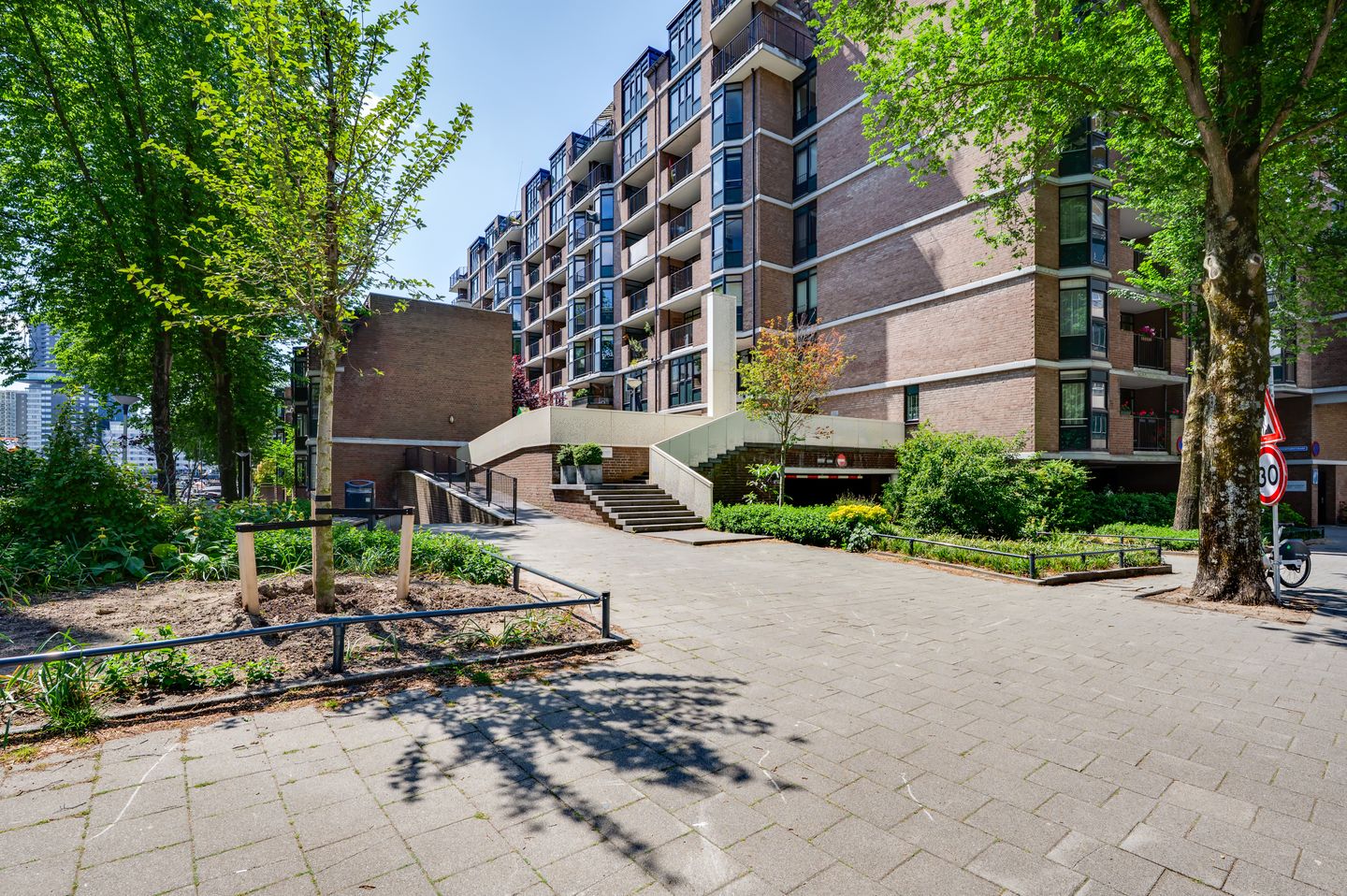 Je komt het complex binnen via de autovrije Scheepmakerskade. Wanneer je het complex betreedt, bereik je de 1e verdieping met de lift of het trappenhuis.
