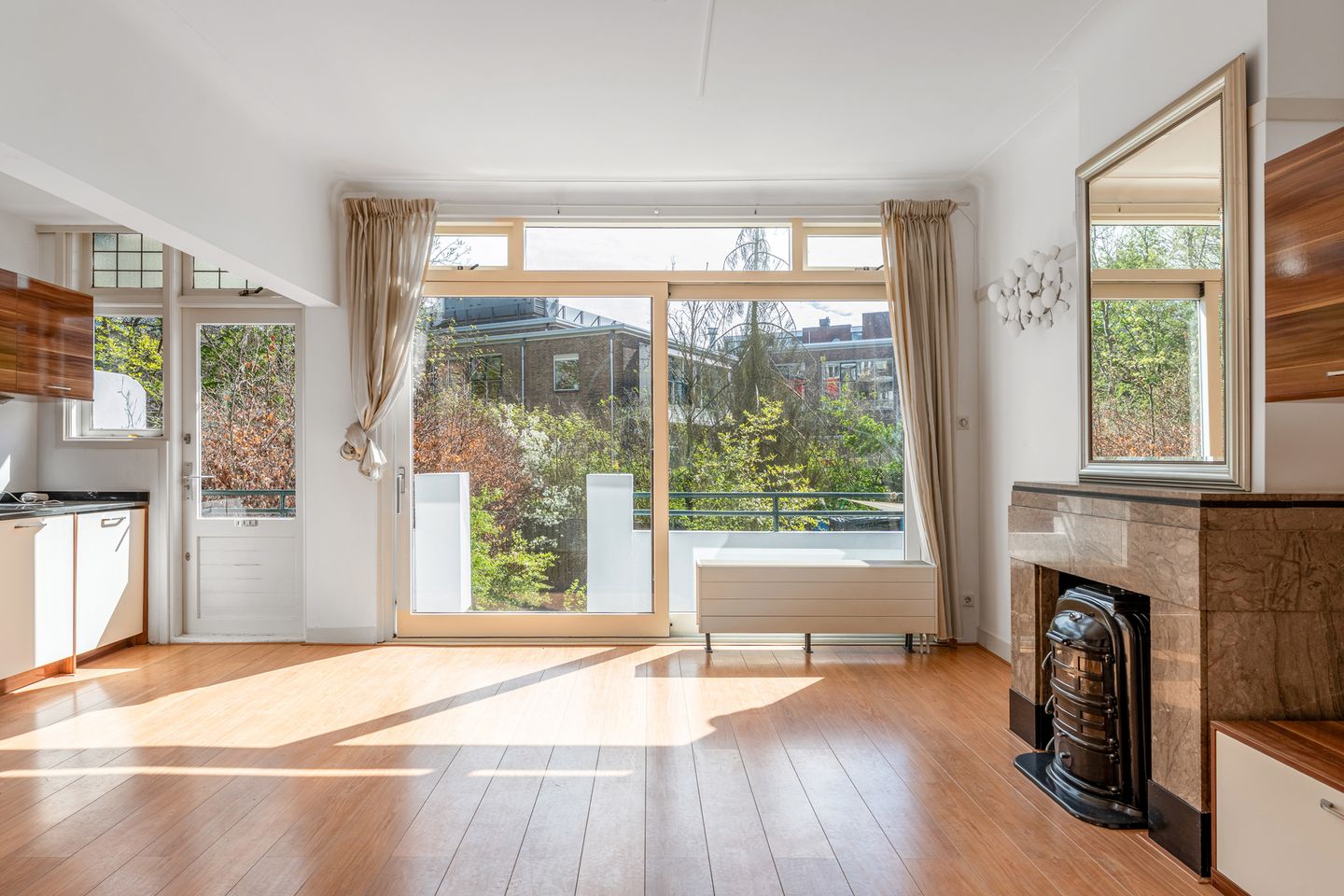 Binnen wacht een royale woonkamer waar sfeer en comfort hand in hand gaan. De ruimte wordt op elegante wijze verdeeld door originele ensuite deuren met authentieke glas-in-loodramen, een prachtig bewaard gebleven detail dat direct in het oog springt. De combinatie van hoge plafonds, karakteristieke elementen en een overvloed aan daglicht maakt deze woonkamer tot een plek waar u zich direct thuis voelt.
