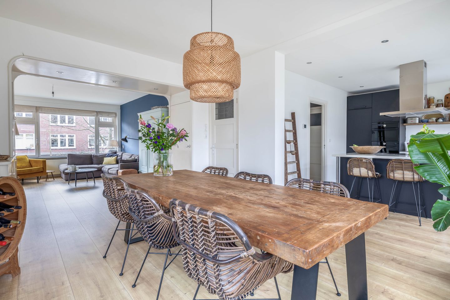 Dankzij de hoekligging stroomt het daglicht hier rijkelijk naar binnen. Een knusse zithoek bij het raam biedt de perfecte plek om met een kop thee te ontspannen en het straatbeeld gade te slaan. In 2019 is de muur tussen de woonkamer en de keuken opengebroken, waardoor een moderne en open leefruimte is ontstaan. De keuken sluit naadloos aan op de woonkamer en biedt een stijlvolle en praktische indeling met hoogwaardige apparatuur en inbouwspots.