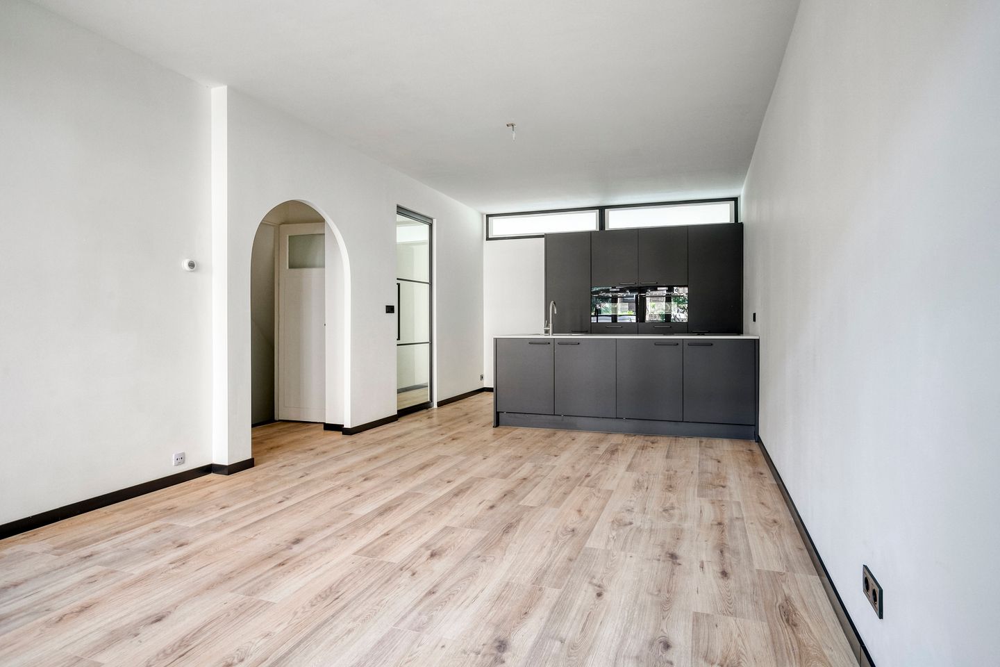 - Woonkamer (ca. 8,20 x 3,70m) met open keuken en toegang tot de tuin. De woonkamer heeft ook toegang tot de gang met badkamer, toilet met vaste wastafel en de trap naar het souterrain.