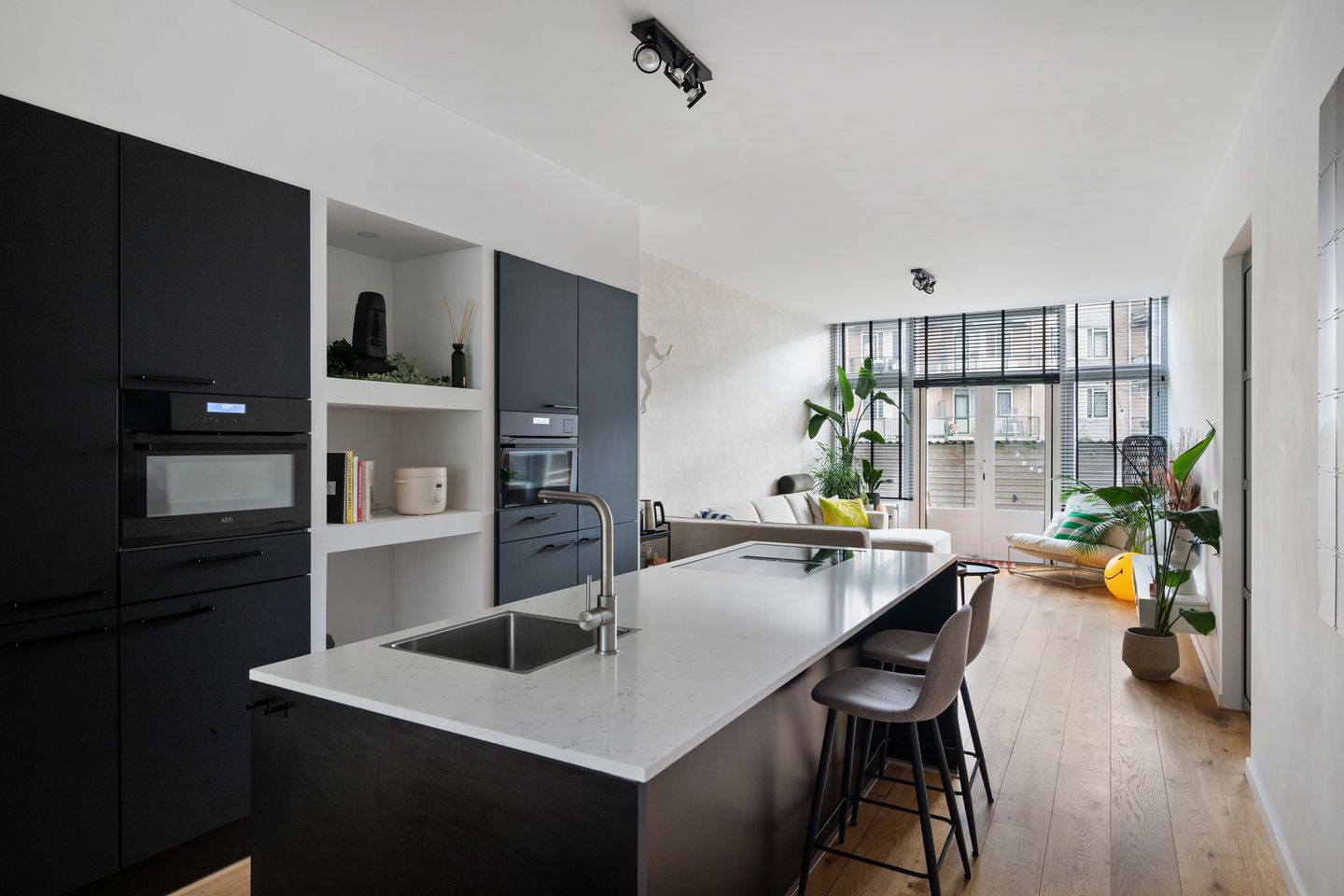 Je betreedt de woning via een eigen entree op de begane grond en komt binnen in de ruime hal met toegang tot de verschillende ruimtes en een fraaie trap naar het souterrain. Vanuit de hal bereik je de lichtrijke (doorzon) woonkamer, die door de grote raampartijen aan zowel de voor- als achterzijde een open en ruimtelijk gevoel geeft. Hier zit je met uitzicht op de tuin, terwijl je de openslaande deuren naar het balkon opent voor een frisse bries. De woonkamer loopt naadloos over in de keuken en eetkamer, met voldoende ruimte voor een grote eettafel. Hier tussenin bevindt zich de moderne mat zwarte keuken met kookeiland, die is voorzien van diverse inbouwapparatuur zoals koelkast, vriezer, magnetron, oven, vaatwasser en een inductiekookplaat met geïntegreerde afzuiging. De eerste verdieping beschikt daarnaast over een slaapkamer welke tevens ook toegang heeft tot de tuin, maar liefst twee vaste kasten en een separaat toilet met fonteintje.