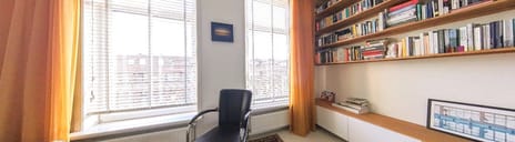 Zeer lichte woonkamer dankzij de grote raampartijen, wat zorgt voor een ruimtelijk en open gevoel. De ruimte is afgewerkt met een moderne vloer, strak gestucte wanden en hoge plafonds. Een op maat gemaakte ingebouwde boekenkast van eikenhout geeft de woonkamer extra warmte en karakter..