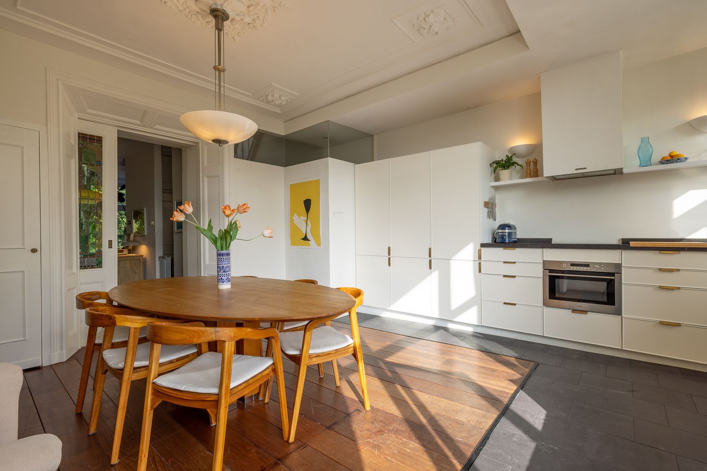 Originele schuifdeuren met glas-in-lood geven toegang tot de royale woonkeuken, voorzien van vernieuwde inbouwapparatuur, granieten werkblad en koperkleurige grepen. In de woonkeuken bevindt zich ook een klassieke schouw en een ingebouwd zitbankje onder het raam.