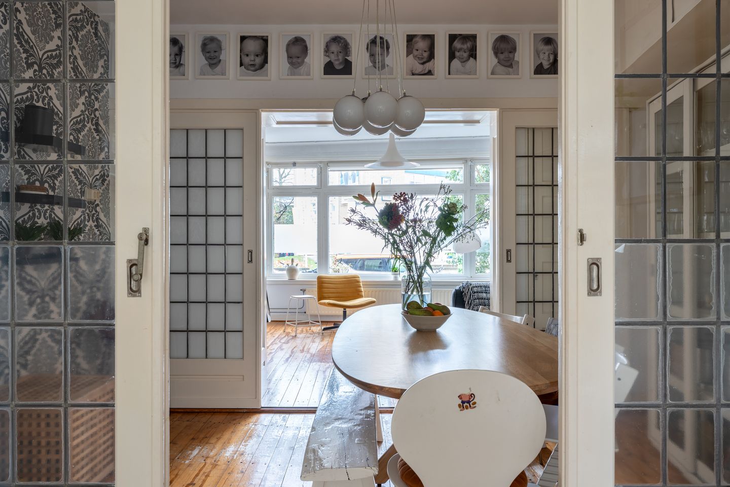 De keuken is verbonden met de eet/tussenkamer (ca. 2.46 x 3.03 m) en te bereiken middels ensuite schuifdeuren met inbouwkasten. De eet-/tussenkamer biedt op haar beurt toegang tot de ruime woonkamer (ca. 4.35 x 4.60 m) via eveneens stijlvolle ensuite schuifdeuren met inbouwkasten.