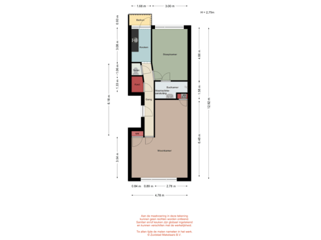 De indeling is praktisch en overzichtelijk: Vanuit de hal zijn alle ruimtes bereikbaar. Aan de voorzijde ligt de lichte woonkamer, waar je eenvoudig een gezellige zithoek en een eethoek kunt creëren. De slaapkamer bevindt zich aan de rustige achterzijde en staat in directe verbinding met de badkamer. De keuken is functioneel ingericht en biedt toegang tot het balkon, een heerlijke plek om even buiten te zitten en te ontspannen.