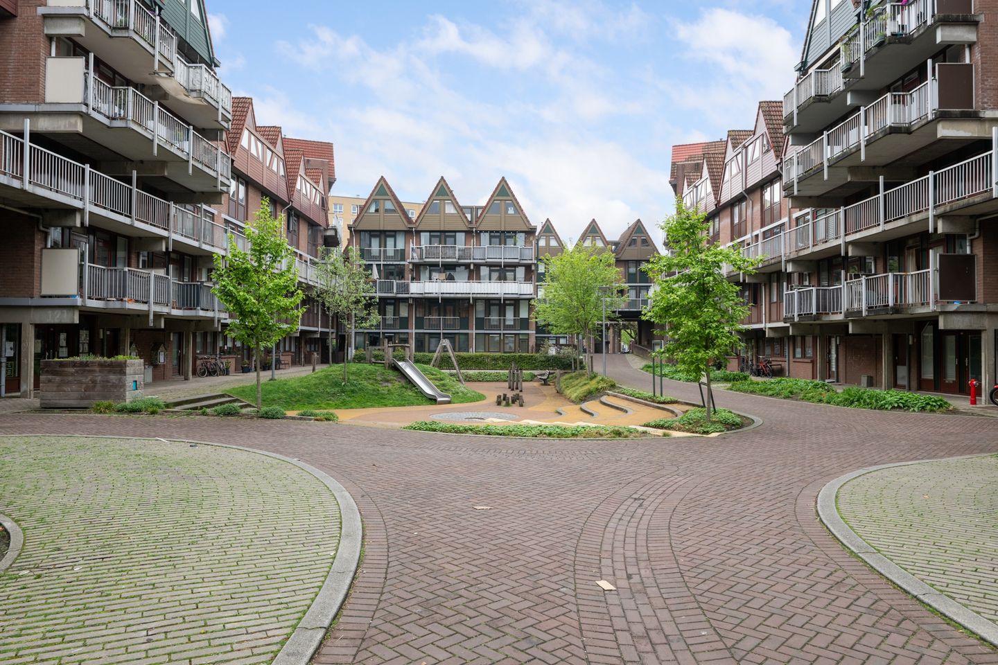 Het complex is opgezet rond een autoluw en kindvriendelijk binnenplein, met veel groen en een speelse opzet. Hier voel je direct de rust, terwijl je je midden in de stad bevindt. De nette liften en het trappenhuis zijn alleen toegankelijk voor bewoners – prettig, veilig en verzorgd.