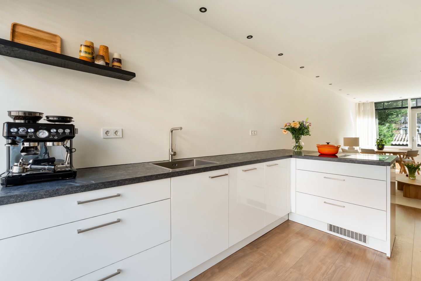 Aan de voorzijde bevindt zich de open keuken, uitgevoerd in een eigentijdse stijl met witte keukenkasten, grote lades en een antracietkleurig stenen werkblad. De keuken is voorzien van diverse inbouwapparatuur, waaronder een inductiekookplaat, vaatwasser, oven, stoomoven en een koel-/vriescombinatie. Aan de zijkant is een praktische ontbijtbar gerealiseerd met zitruimte voor twee à drie personen.