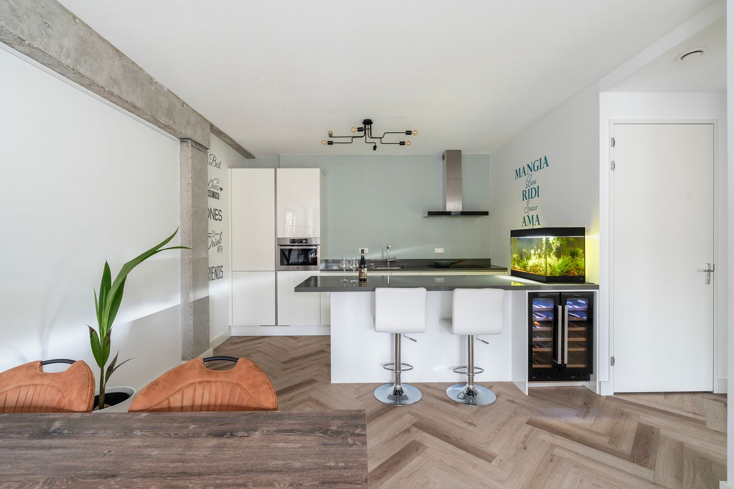 Entree in de woning. De woonkamer met open keuken vormt het hart van het appartement en is modern en sfeervol ingericht. De keuken is voorzien van een kookeiland en als extra luxe een wijnklimaatkast, ideaal voor liefhebbers.
