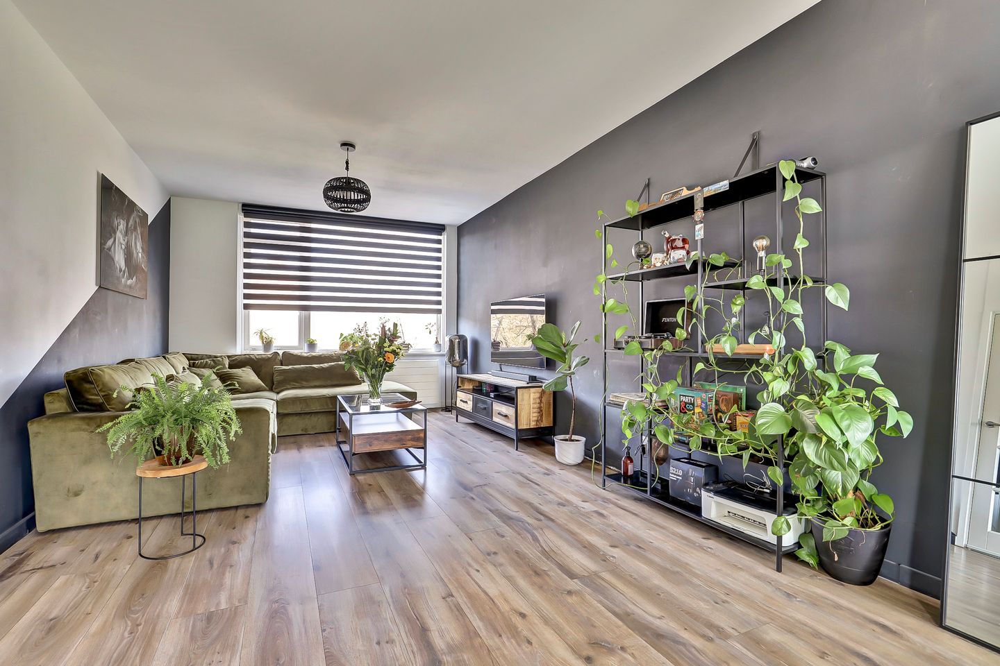 * De ruime doorzon woonkamer is voorzien van een laminaatvloer en biedt een fijn uitzicht over de groenstrook;