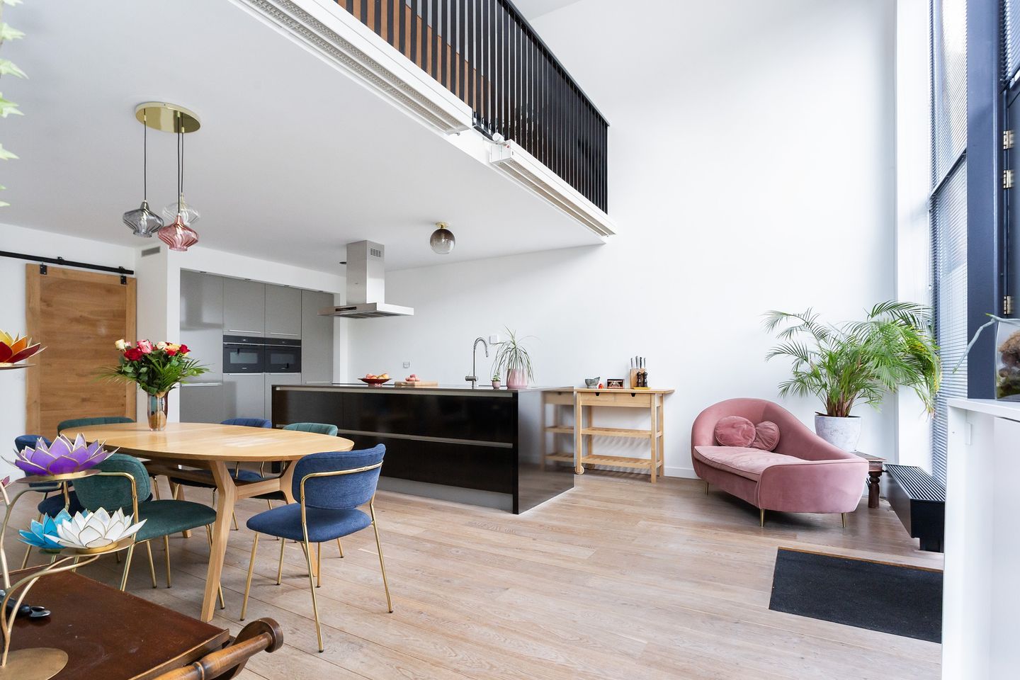 Je stapt binnen in de royale woonkeuken, waar het daglicht je tegemoet komt dankzij de hoekligging en de plafondhoge ramen. Er is ruimte genoeg voor een flinke eettafel, perfect voor lange diners met vrienden of familie. De keuken is strak, modern én voorzien van nieuwe inbouwapparatuur. Over de gehele benedenverdieping ligt een lichte parketvloer, in combinatie met de gestucte wanden zorgt deze voor een rustige, warme uitstraling. Via de trap in de woonkeuken kom je op de vide, waar zich de woonkamer bevindt. Deze is ruim, sfeervol en perfect voor een gezellige zithoek.