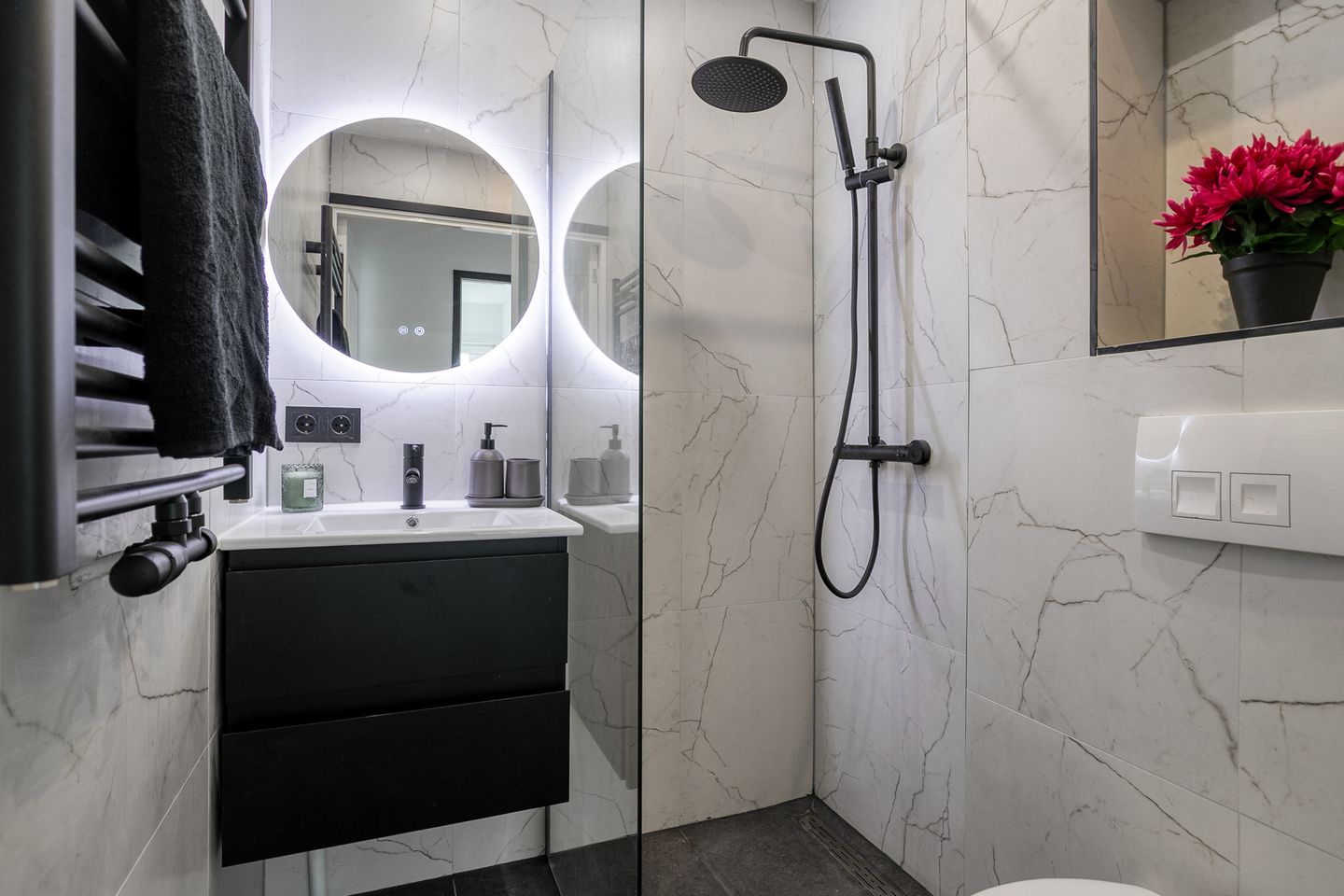 – Keurig wit/zwart betegelde badkamer (ca. 1,60 x 1,60m) met douche, toilet, wasbak en radiator.