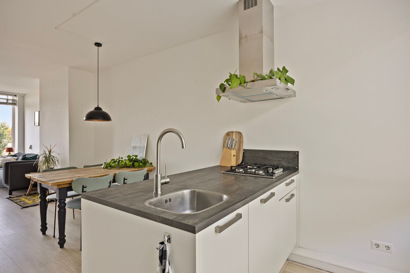 * Open keuken aan de voorzijde (voorheen slaapkamer), uitgevoerd met een modern keukenblok in schiereilandopstelling en voorzien van diverse inbouwapparatuur: vaatwasser, gaskookplaat, afzuigkap, koel-/vriescombinatie en combimagnetron.