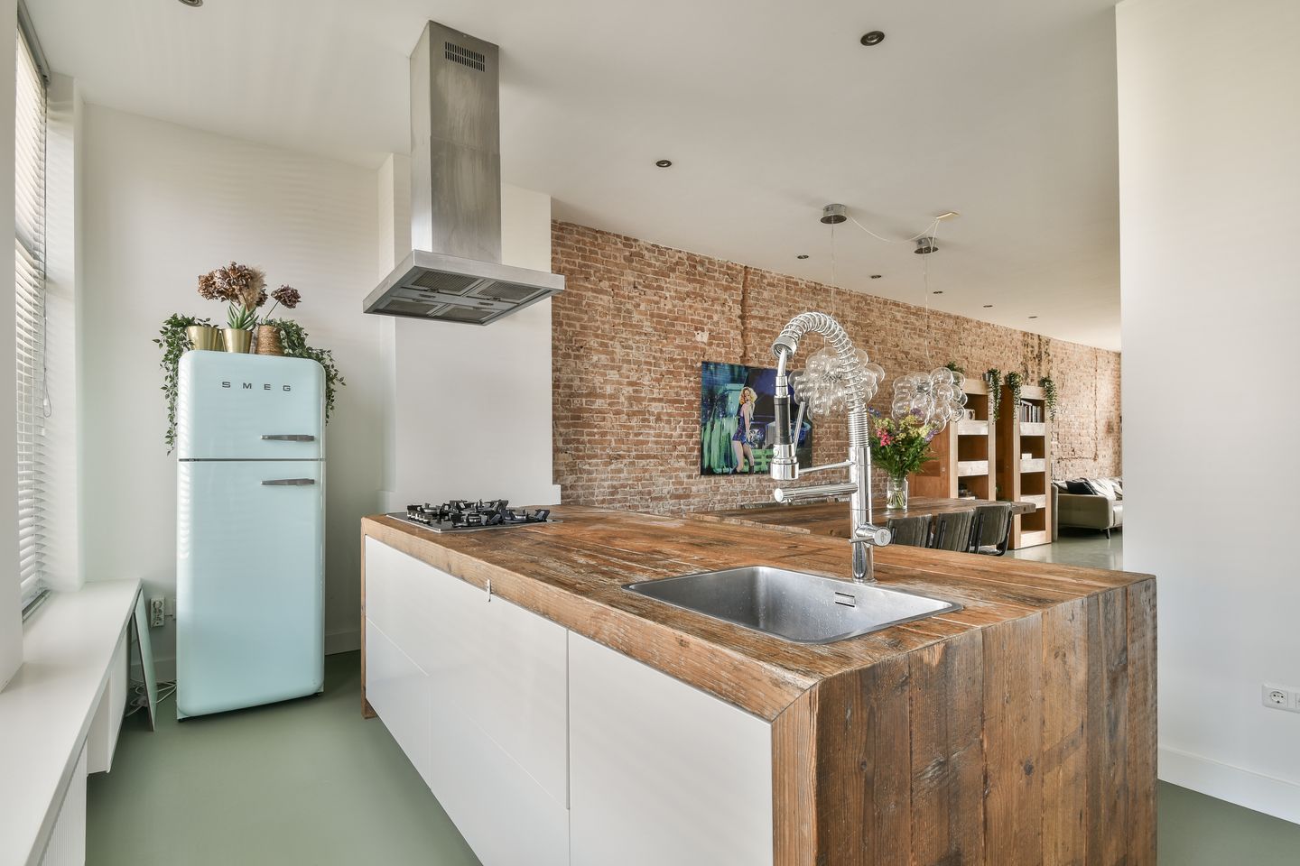 Here, the generous loft-style through-living room takes centre stage, with a cosy fireplace and a stylish kitchen island. The exposed brick wall and walkable glass panels create visual interest and a connection between the floors. The modern kitchen is fully equipped with built-in appliances, including a (combi) oven, SMEG fridge-freezer, dishwasher, and five-burner gas hob. The kitchen island with breakfast bar is perfect for casual meals or enjoying drinks while cooking. Thanks to the open-plan design, the entire space is filled with natural light — ideal for relaxing or hosting at the large dining table. This floor also includes a separate toilet, a built-in cupboard, and stairs to the top floor.