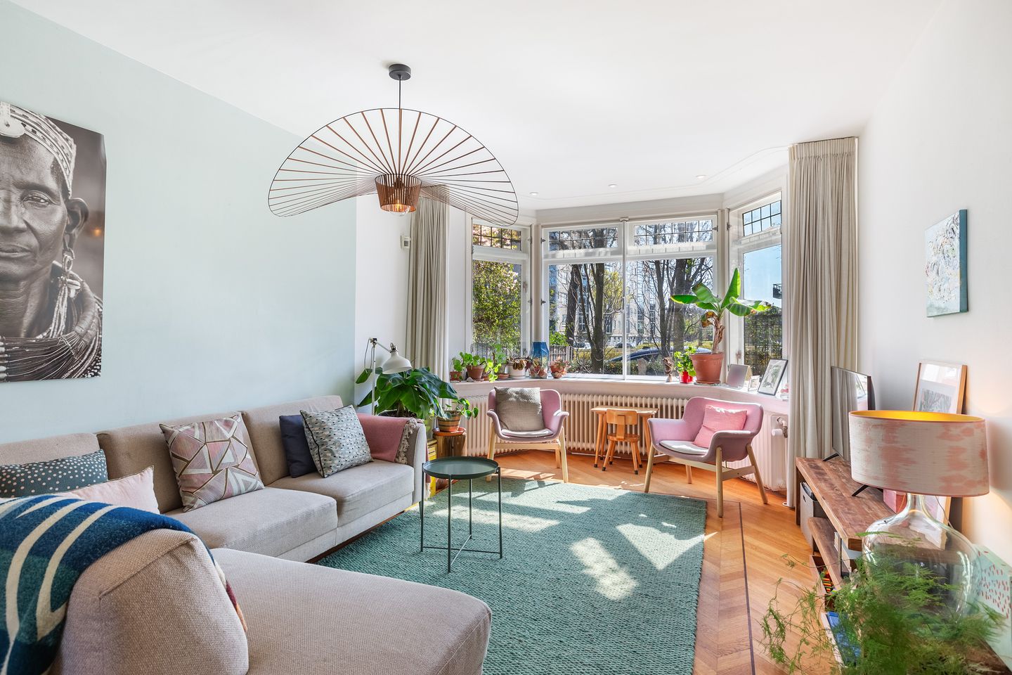 De grote kamer aan de achterzijde heeft openslaande deuren naar het balkon. Ook de grote kamer aan de voorzijde heeft dubbele deuren naar een balkon, een zeer charmant balkon met recent geplaatste markies. Aan de voorzijde naast deze kamer bevindt zich de 3e slaapkamer, een lieve kamer met fraai glas in lood, geschikt als kinder- of werkkamer.