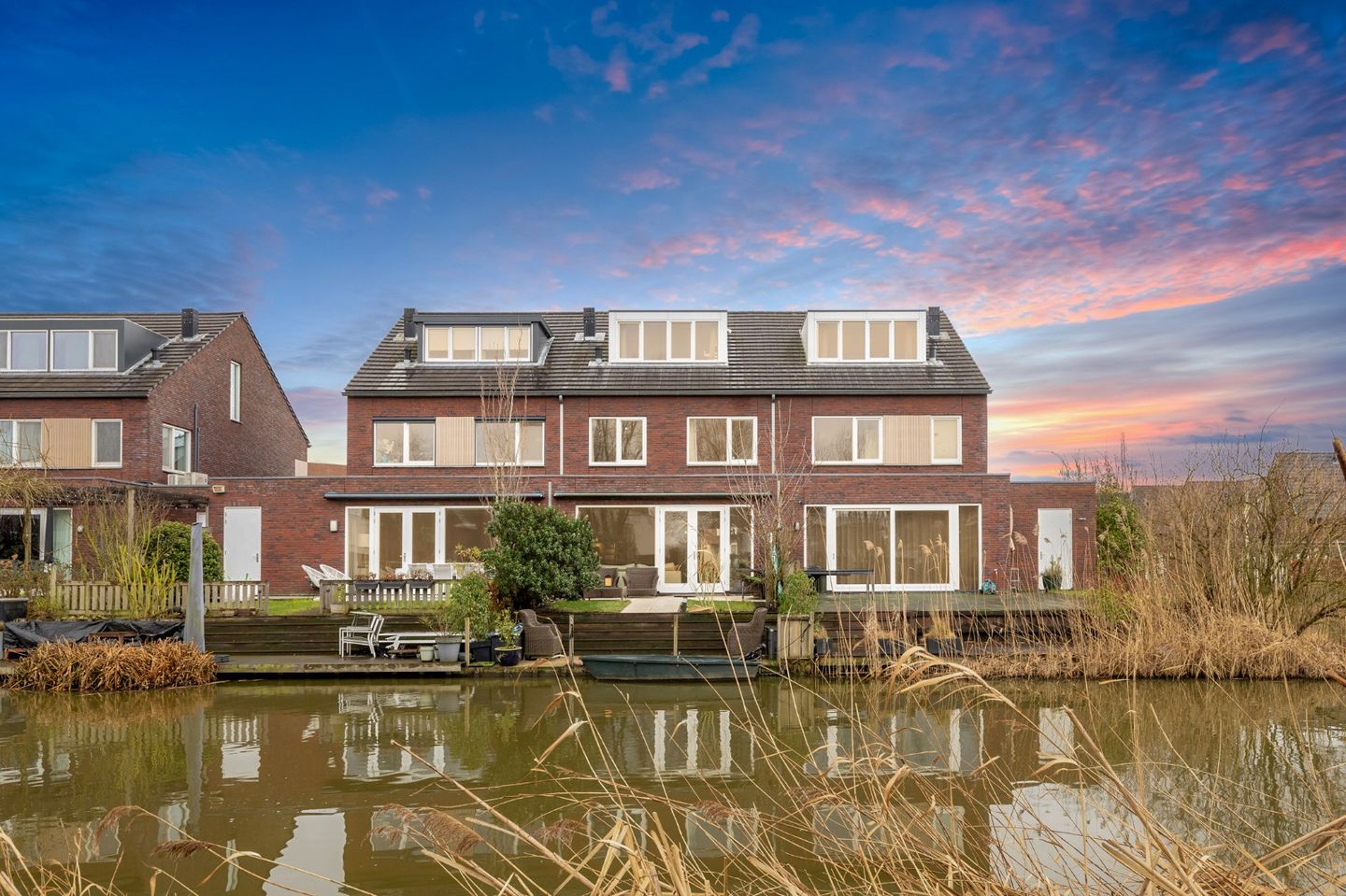 Via twee openslaande deuren (met hordeur en er is een elektrisch zonnescherm) is de heerlijke achtertuin te bereiken gelegen op het noordwesten. Hier is plek voor meerdere gezellige zithoeken en er is een wateraansluiting. Via een trapje naar de vlonder aan de waterkant is er plek voor een bootje en is het mogelijk om rond te varen door de leuke wijk. En als het gevroren heeft kan er geschaatst worden in je eigen achtertuin!