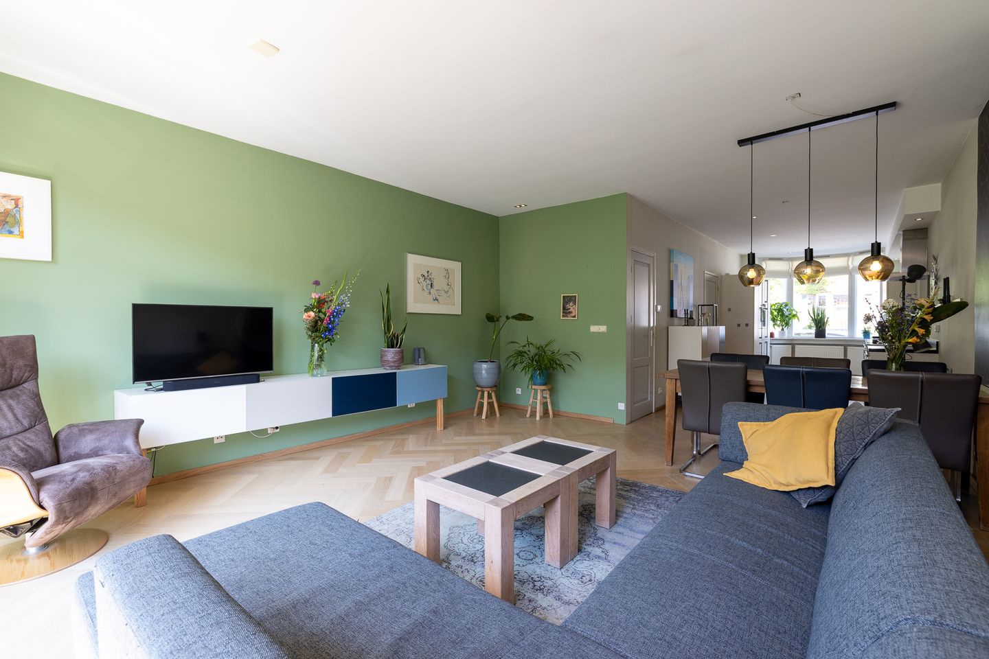 De woonkamer aan de achterzijde is een heerlijke plek voor een royale opstelling. Kamerbrede raampartijen, openslaande deuren naar de tuin en een prachtige visgraatvloer maken dit een echte leefruimte. De zonnige tuin (ca. 13 meter diep) is gelegen op het westen en heeft achterin de tuin een "buitenwoonkamer'. Dit is een mooie overkapping voorzien van elektra en een berging — ideaal voor lange zomeravonden, barbecue feestjes of een rustig koffiemoment in het groen.