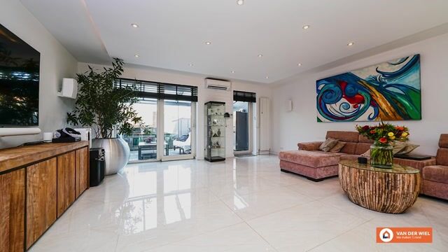 * De doorzon woonkamer is voorzien van een plavuizen vloer met vloerverwarming. In het plafond bevinden zich 16 Hue inbouwspots, op afstand bedienbaar met dimfunctie en kleuraanpassingen.
